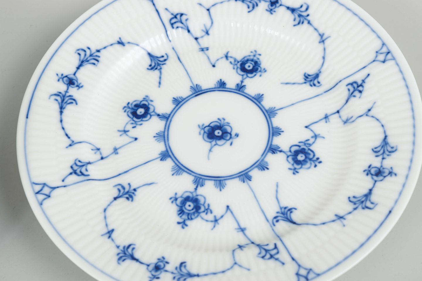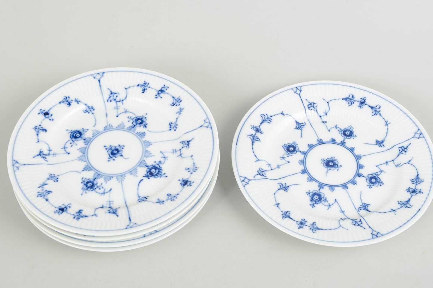 Sæt på 5 runde kagetallerkener i porcelæn dekoreret i underglasurblåt med det klassiske Musselmalet Riflet-mønster. Model 1/180.