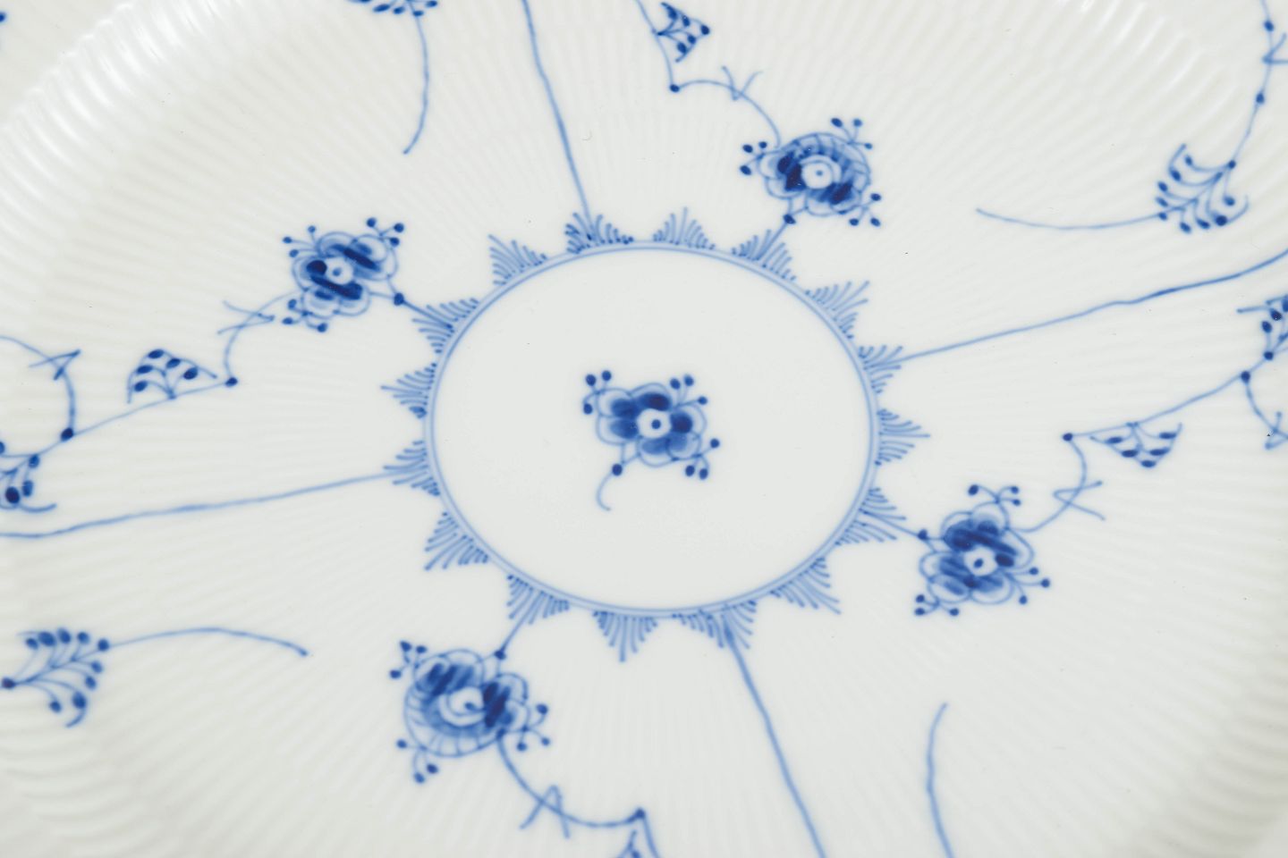Rundt serveringsfad i porcelæn dekoreret i underglasurblåt med det klassiske Musselmalet Riflet-mønster. Model 1/107.