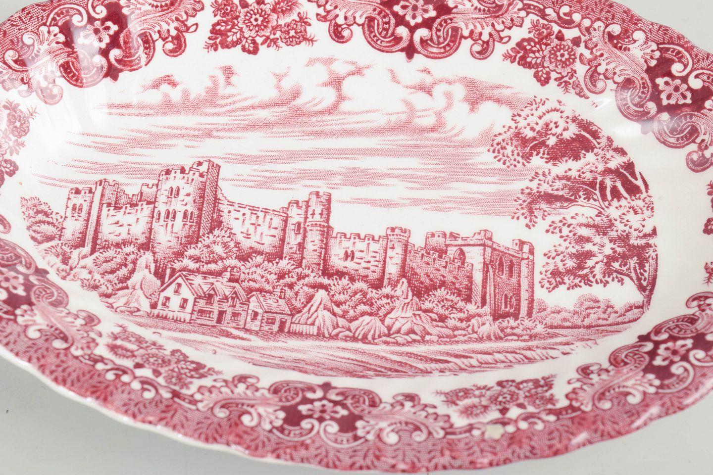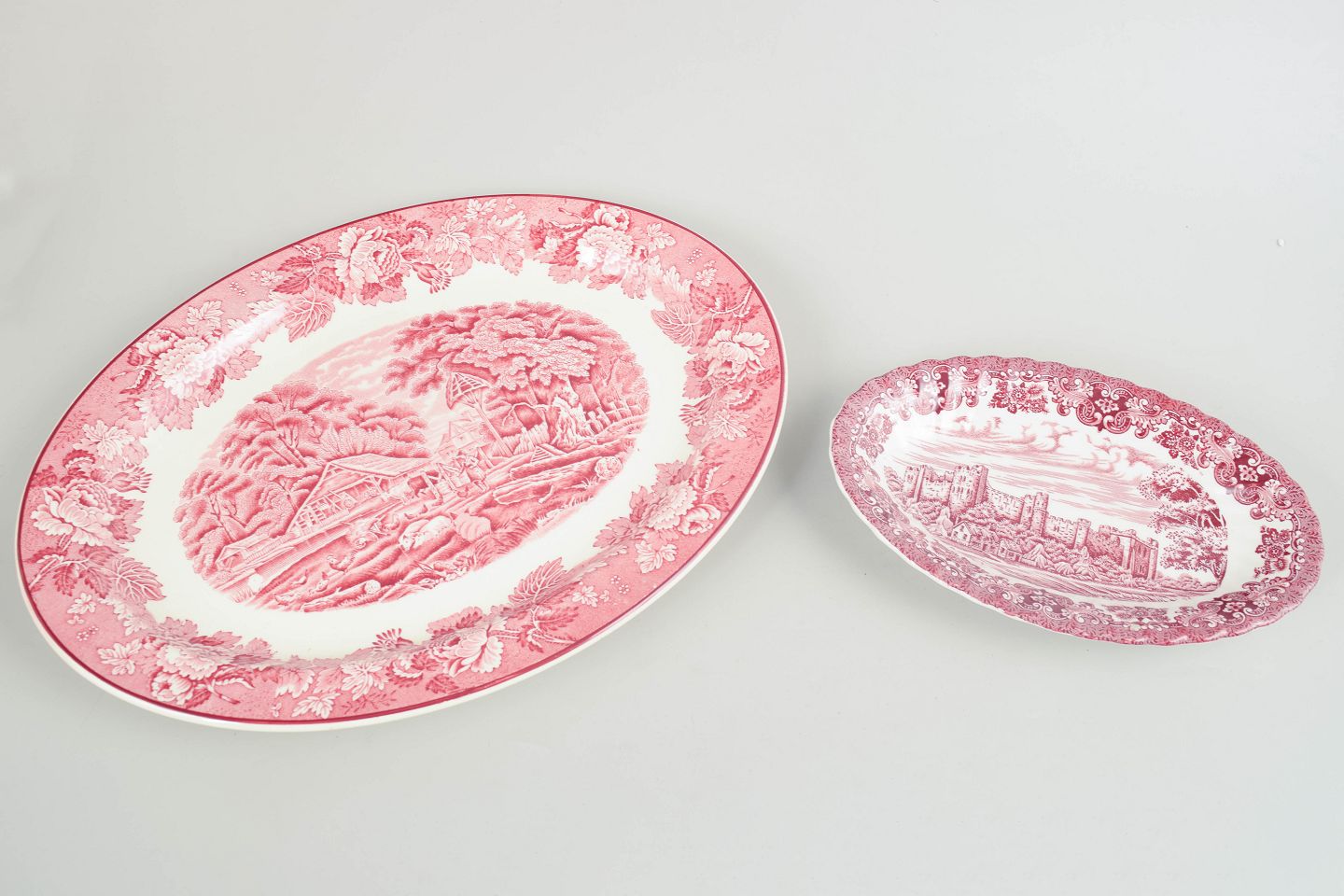Serveringsfade i fajance fra Olde Country og Wood & Sons, dekoreret i rød transferware med landskabs- og arkitekturmotiver samt ornamentale borter.