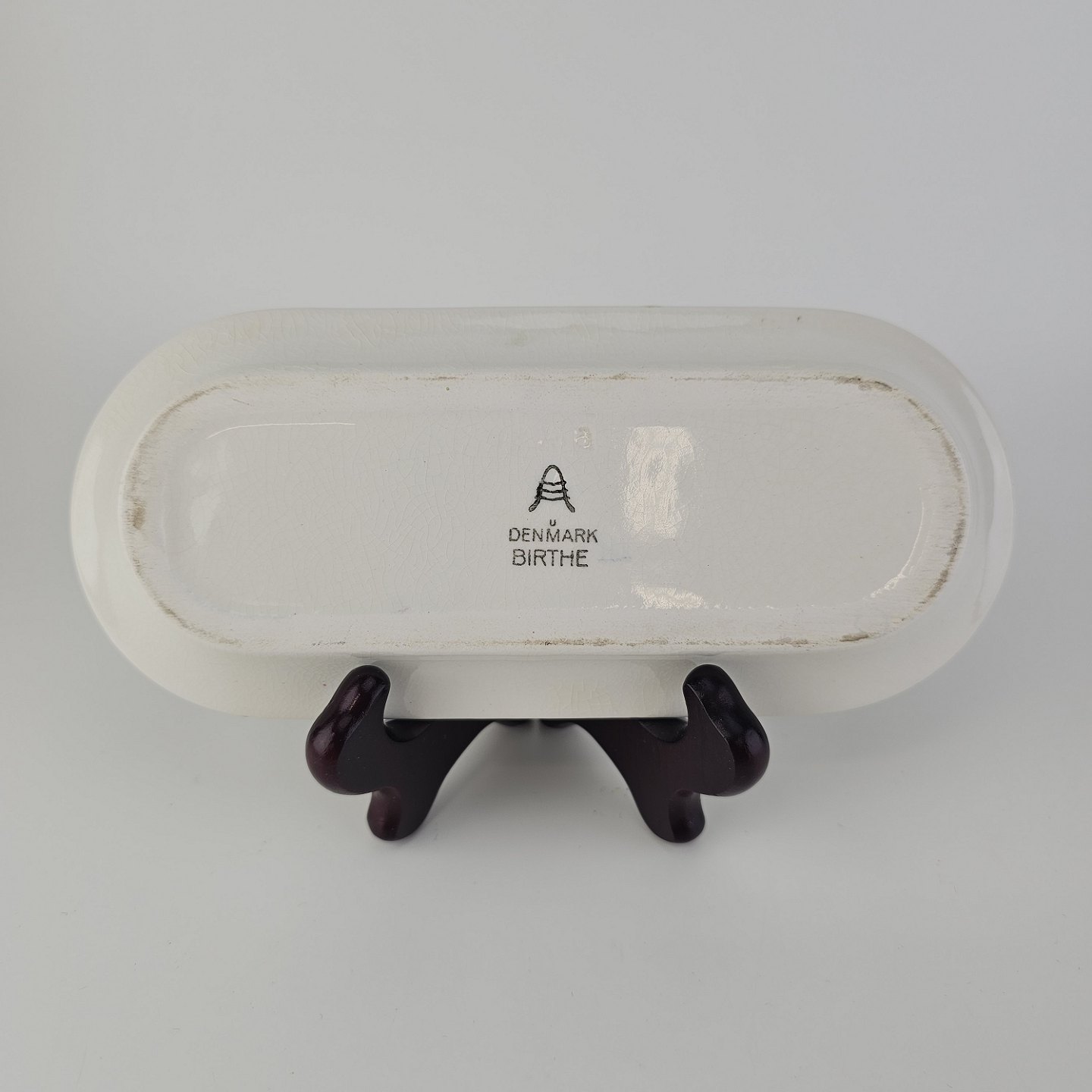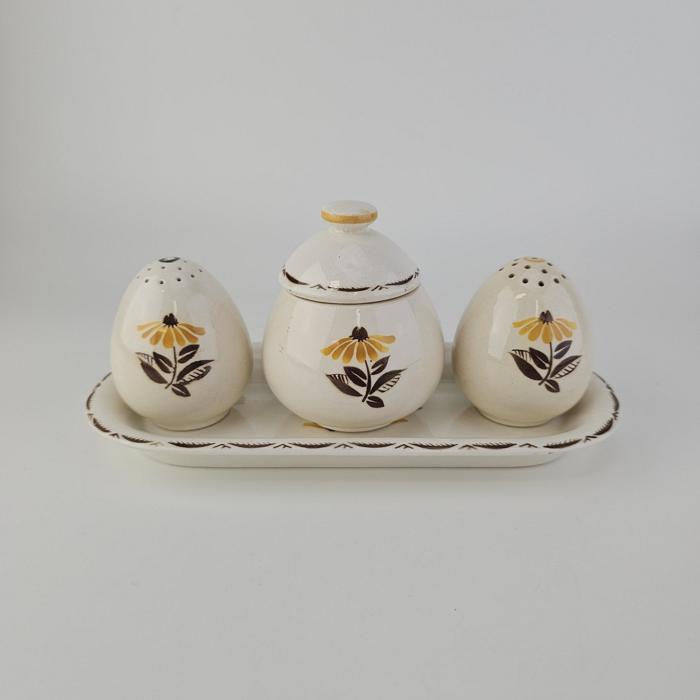 Trekantet fad med sennepskrukke, saltbøsse og peberbøsse i fajance fra stellet Birthe