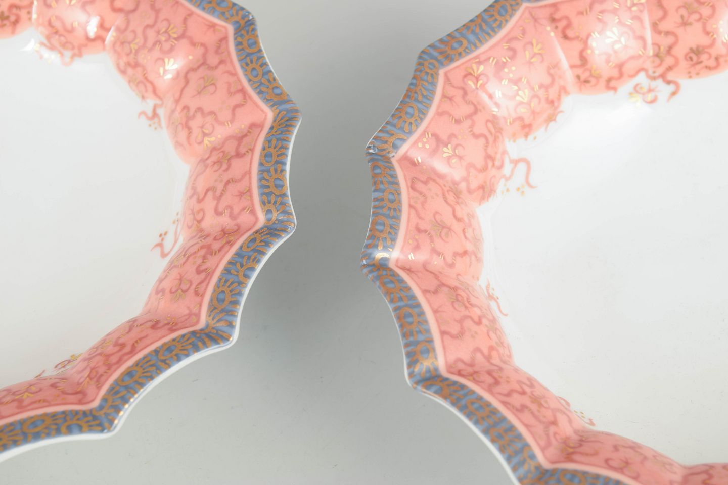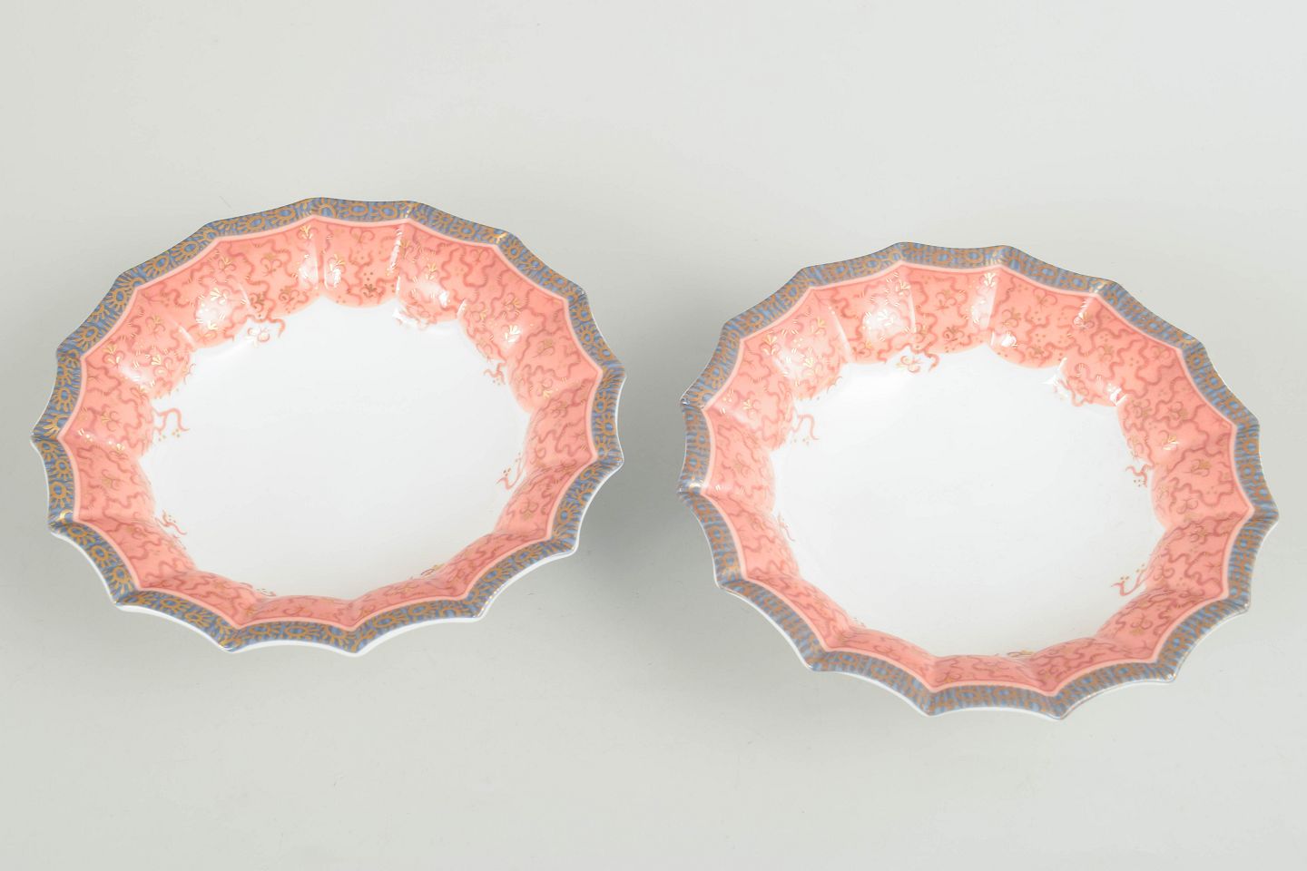 To lave skåle i hvidt porcelæn dekoreret med Fairytale-mønster i bløde rosa toner langs den bølgede kant. 1. sortering. Model 351.
