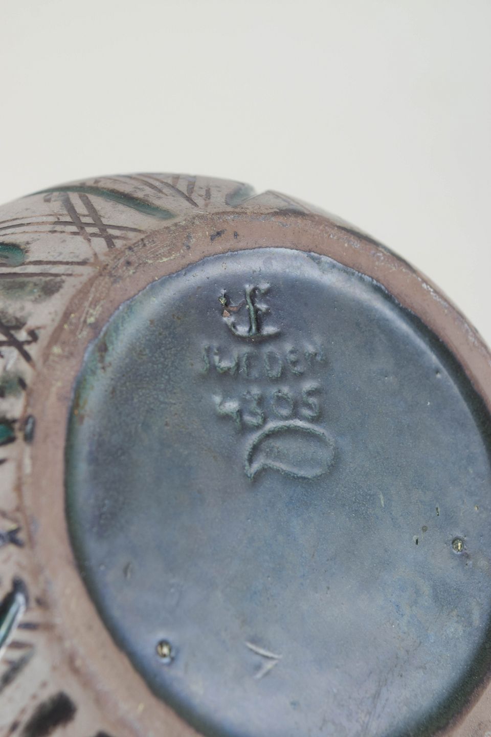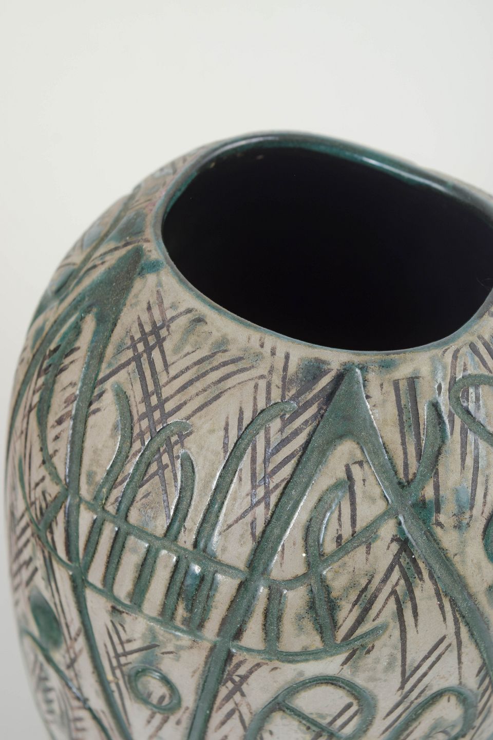 Dekorativ stentøjsvase med karakteristisk reliefdekoration i grønne og grå nuancer. Vasen er udført i serien Hedenhös og er formgivet med organiske linjer og indridset mønster. Model 4305.
