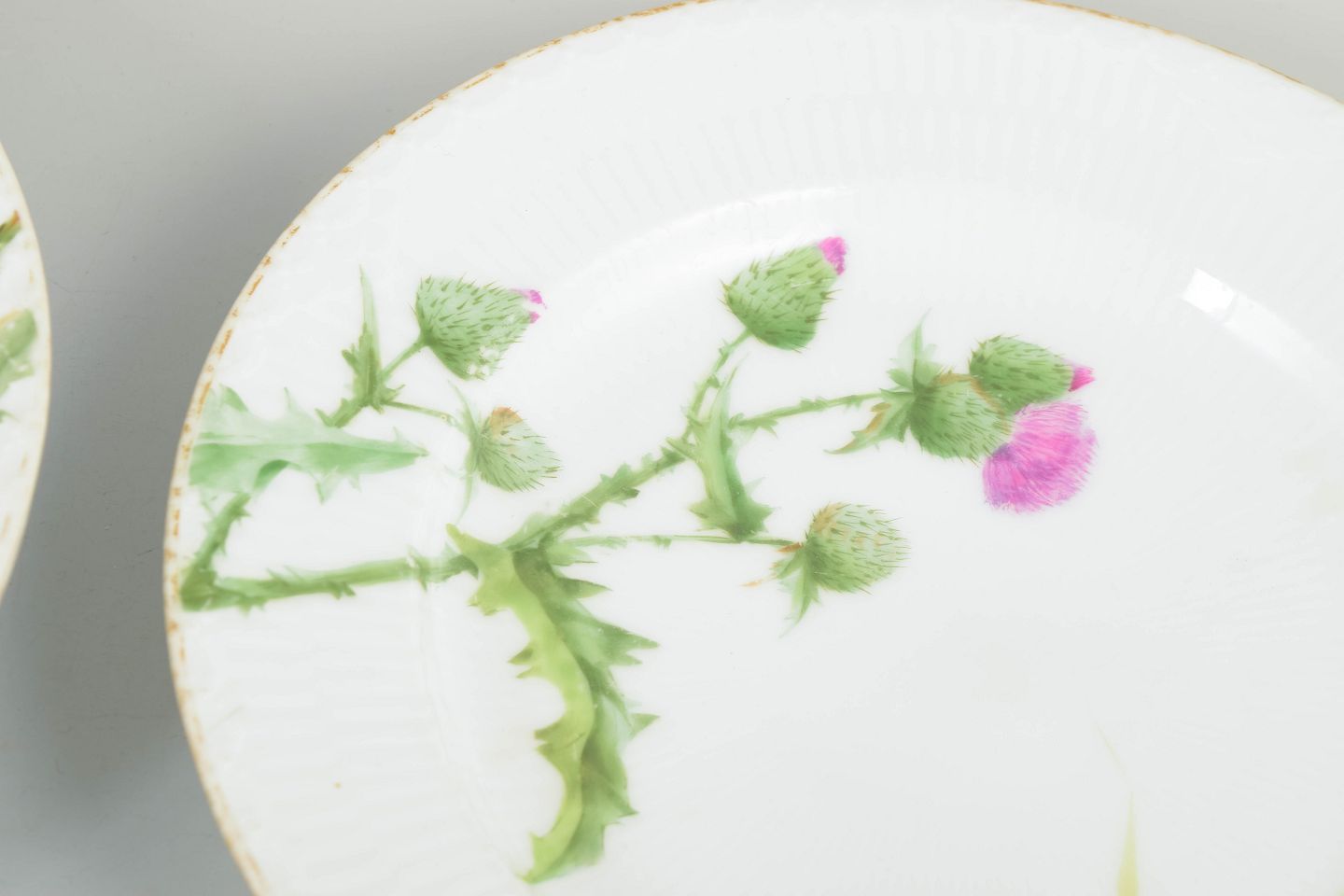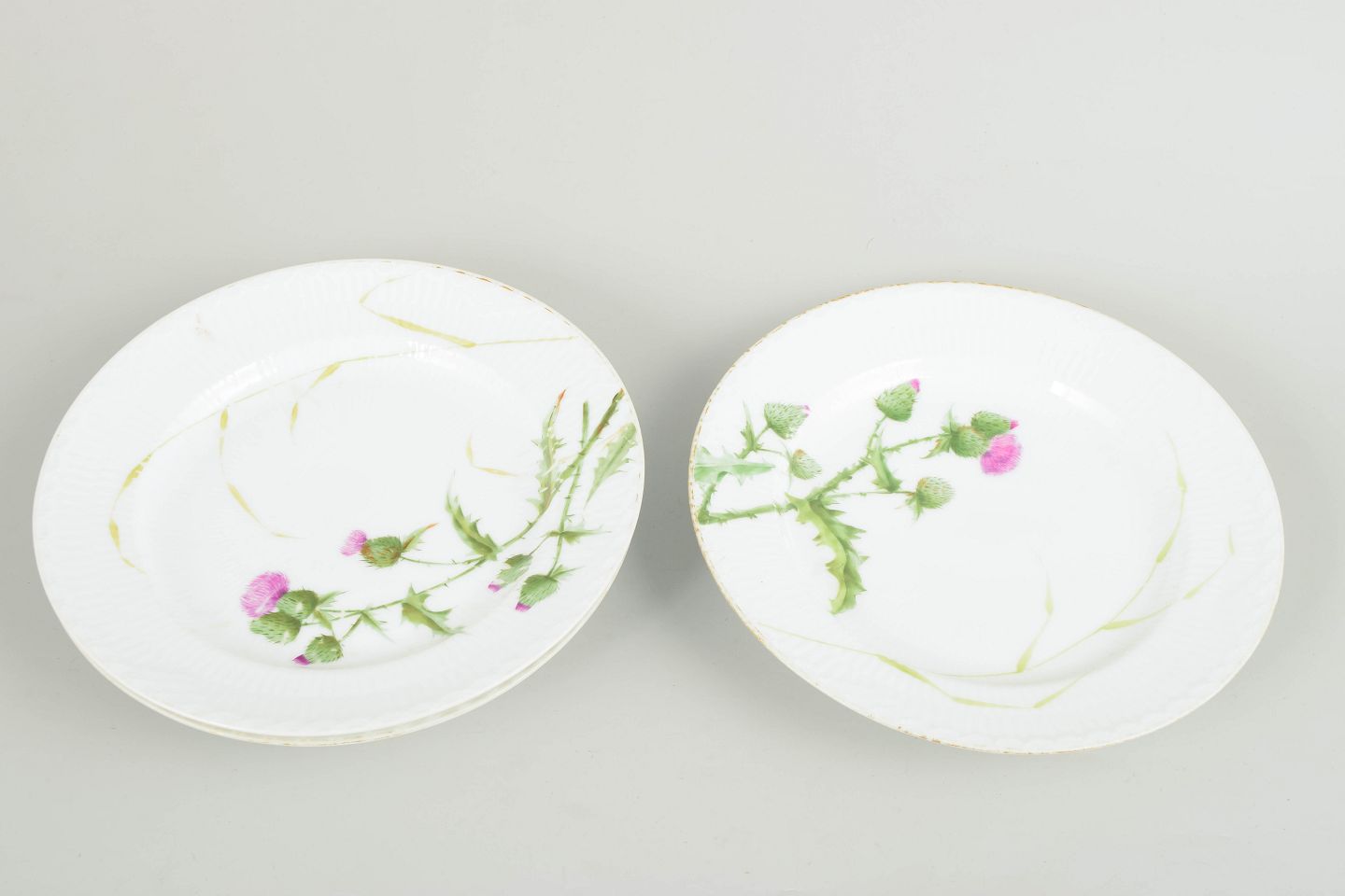 Håndmalede porcelænstallerkener med naturalistisk dekoration med tidselmotiv og forgyldt rand. Tallerkenerne har let riflet overflade og viser det høje håndværksmæssige niveau, som kendetegner Royal Copenhagens produktion i anden halvdel af 1800-tallet.