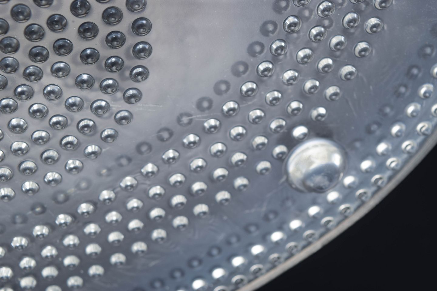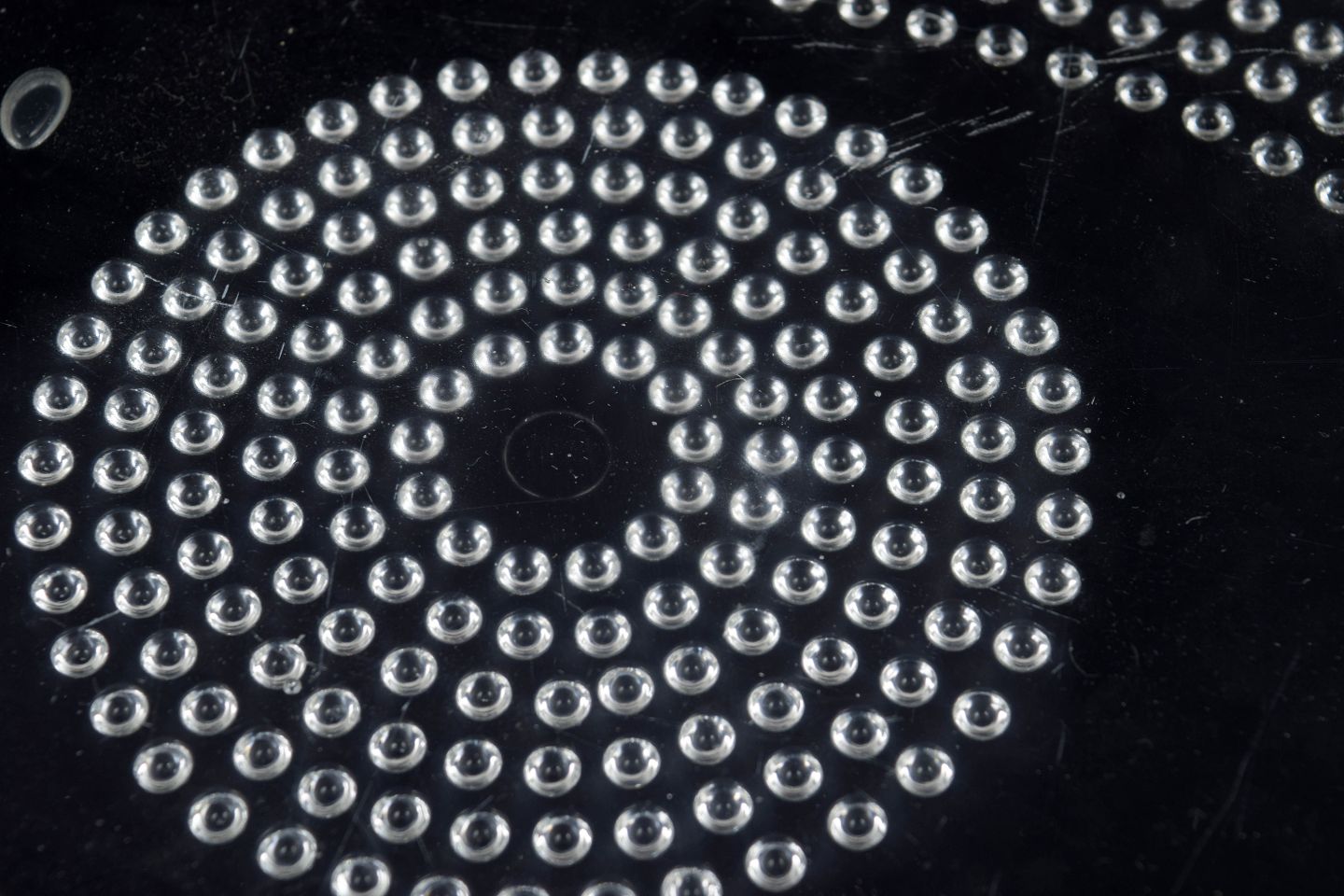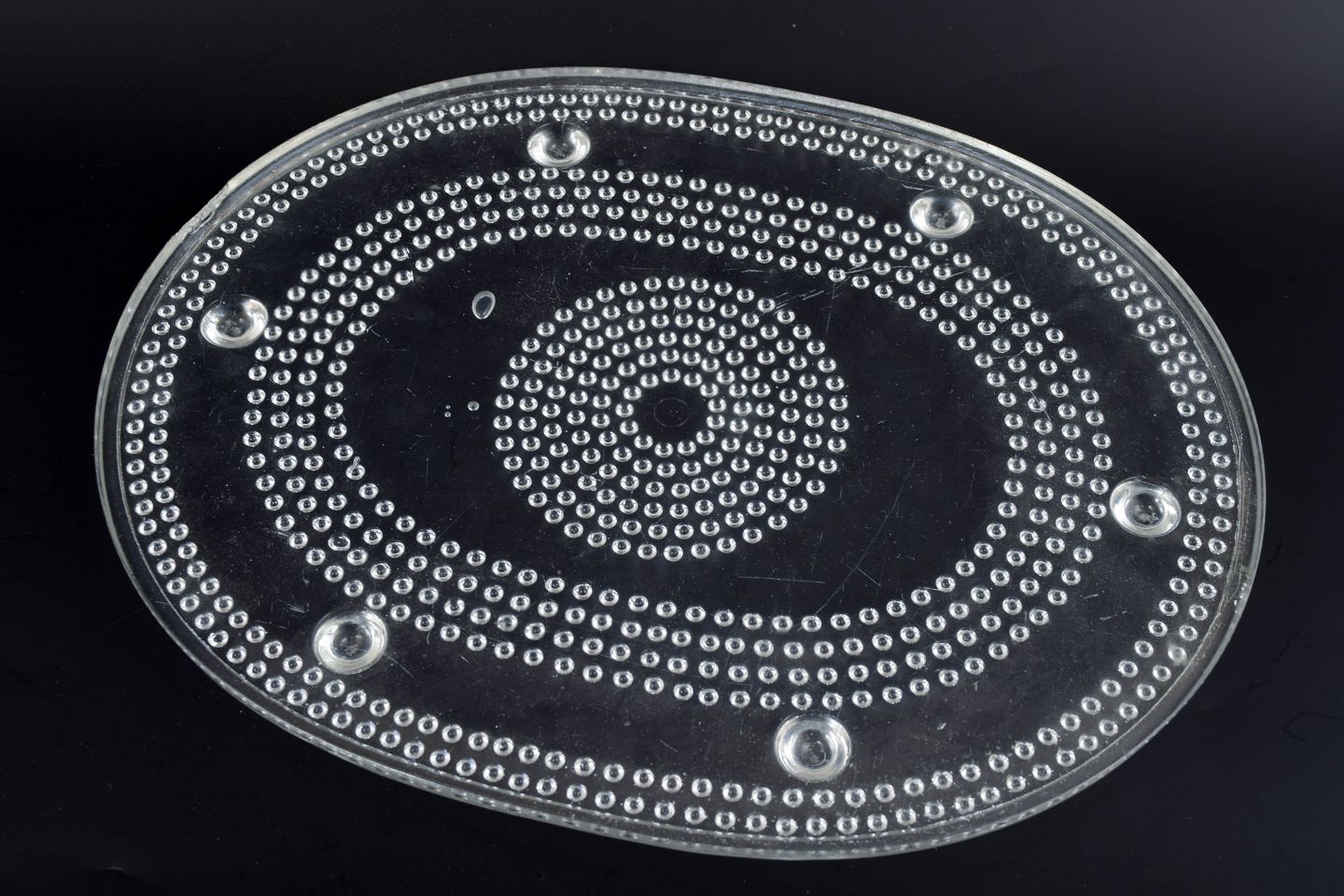 Stor oval bakke i klart kunstglas med koncentriske cirkler af knoprelief og ophøjede fødder. Fremstillet i presset glas.