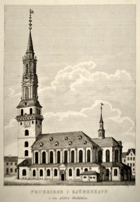 Unbekannter Künstler (18. Jahrhundert): Liebfrauenkirche in Kopenhagen in ihrer älteren Form. Kupferstich. Höhe: 26 cm. Breite: 17 cm.
