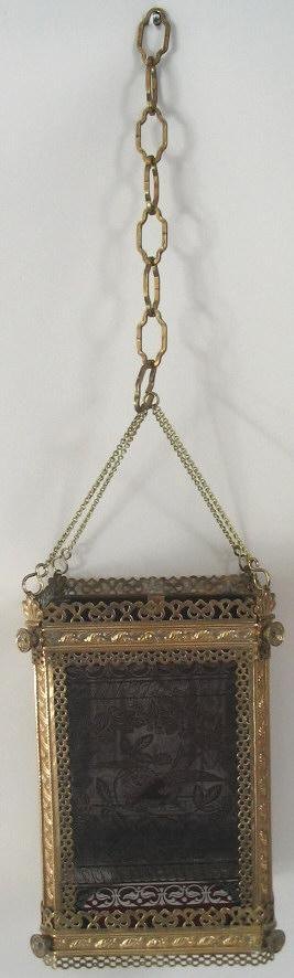 Ampel, Deutschland, ca.1880. In durchstochene Messing mit Dekorationen in Form von Rosen, abgewalmene Ecken und Knospen. Afgehängt in eine Kette. Seiten in Form von Klarglas. Mit  Auflagdekoration in Rot, mit einer junge Frau in einem Garten und ein Vogel auf einem Zweig. Der Boden aus klaren Glas. H:. 30 cm. B:. 21 cm.