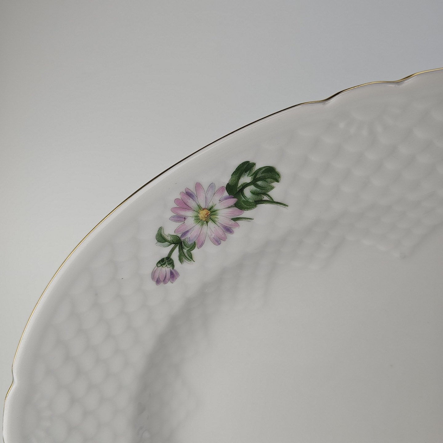 Krysantemum er hvidt porcelæn dekoreret med lys lilla blomst, grønne blade og guldkant.