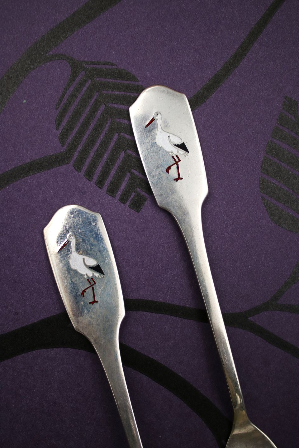 Barnebestik , ske og gaffel i sølv (stemplet) med storke motiv øverst på skaftet. L: 15cm. Vægt: 52,5 gram. (sælges kun samlet)