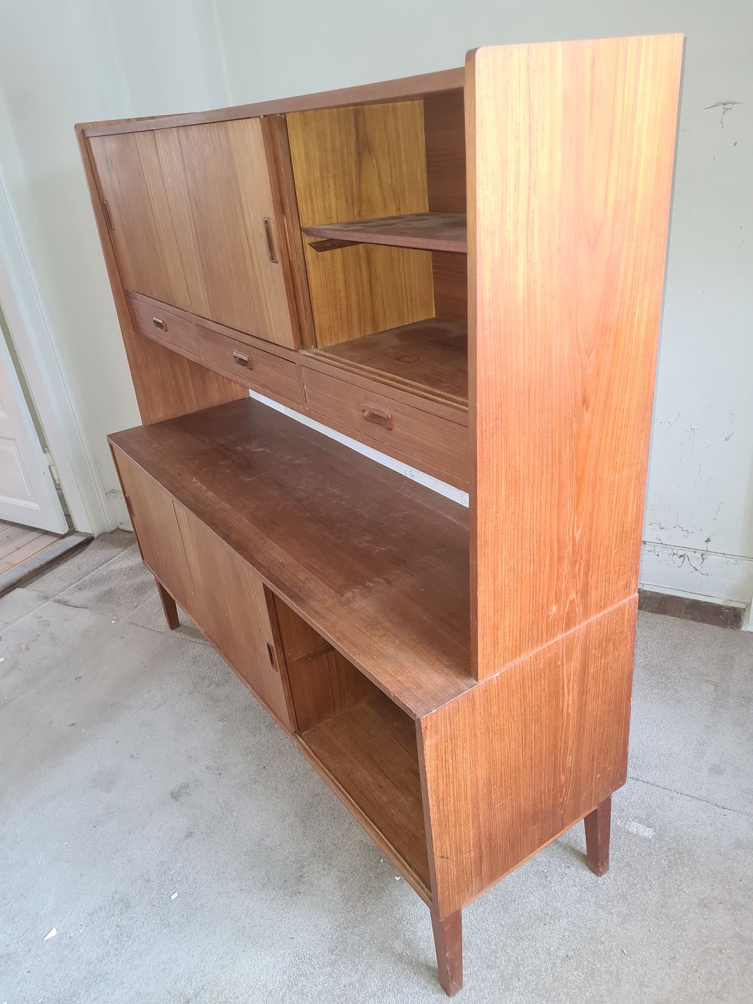 Dobbelt skænk fra 1960'erne i teakfinér. Fremstår pæn og ok velholdt, dog med manglende hylde nederst til højre og enkelte finér skader. (Billede)