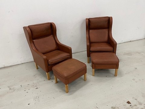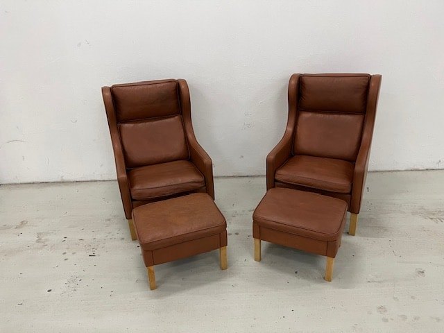 Mogens Hansen MH195 Ohrensessel mit passendem Hocker. Cognacfarbenes Semianilinleder, Eichenholzbeine. Neupreis: 62.606 DKK. Die Sessel sind in sehr gutem Zustand und wurden nur selten benutzt. Sie stammen aus einem Nichtraucherhaushalt ohne Haustiere. Das Set ist auch einzeln inklusive Hocker erhältlich. Preis pro Set (Sessel und Hocker): 17.000 DKK. Exklusive, hohe Ohrensessel im klassischen und zeitlosen Design von Mogens Hansen. Die Sessel sind mit Daunenpolstern ausgestattet, die optimalen Komfort und eine elegante, einladende Optik garantieren. Ein Sessel, der Ästhetik und Funktionalität vereint und jedem Interieur Stil und Komfort der Extraklasse verleiht. Die passenden Hocker sind aus den gleichen exklusiven Materialien gefertigt und entsprechen der gleichen Designlinie. Dank der Daunenpolsterung bieten die Hocker hohen Sitzkomfort und ergänzen die Stühle harmonisch. Designer: Mogens Hansen Maße – Stuhl: Länge: 72 cm, Tiefe: 90 cm, Höhe: 106 cm, Sitztiefe: 51 cm, Sitzhöhe: 42 cm Maße – Hocker: