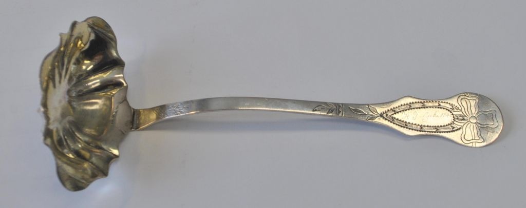Thomas Jensen (1764–1825), Aabenraa, Dänemark: Empire-Saucenlöffel aus Silber. Gestempelt. Mit Verzierungen und Gravuren. U. a. Johan Christensen etc. Länge: 19,5 cm.