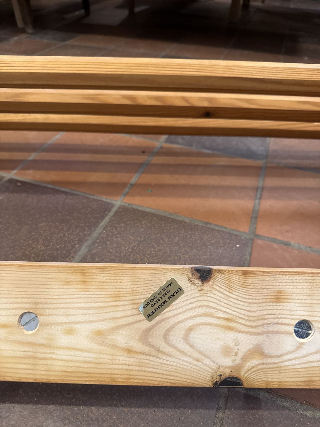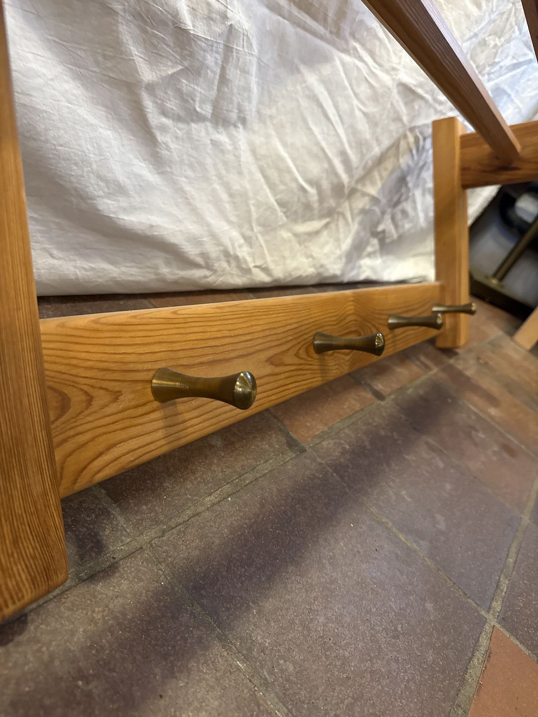 Text zugänglich auf Dänische: Svensk design væghængt knagerække/hattehylde i massiv fyr og knager i messing.