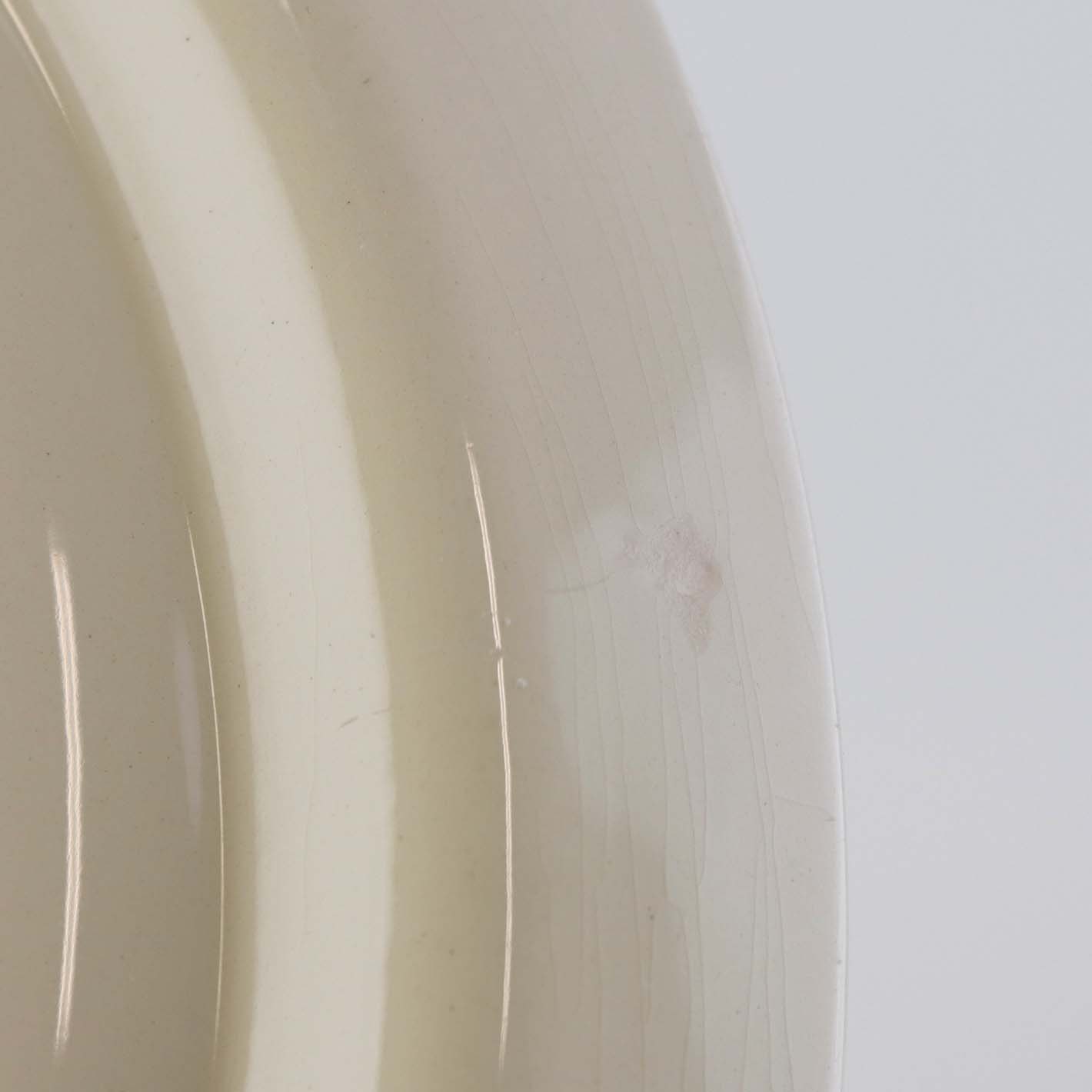 Fremstår med ujævnhed i glasuren og krakkeleringer i glasuren.