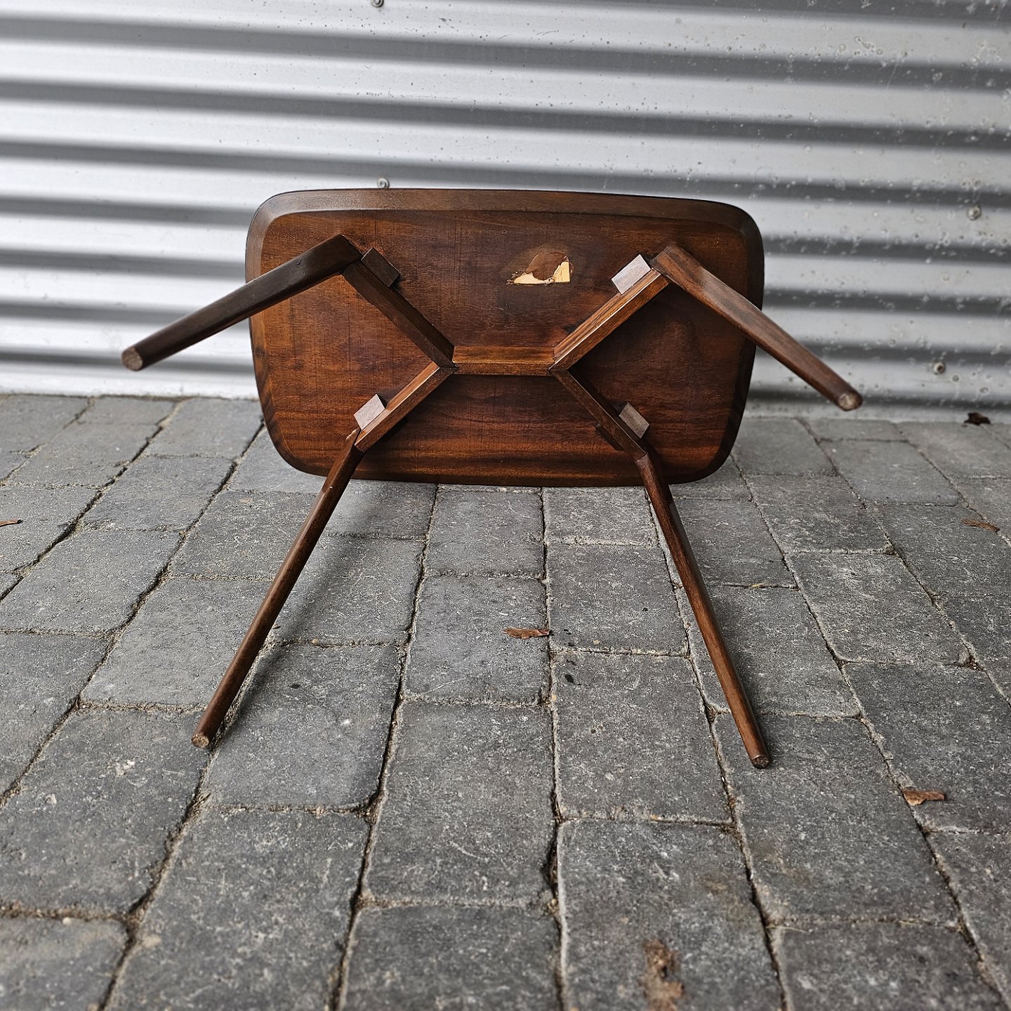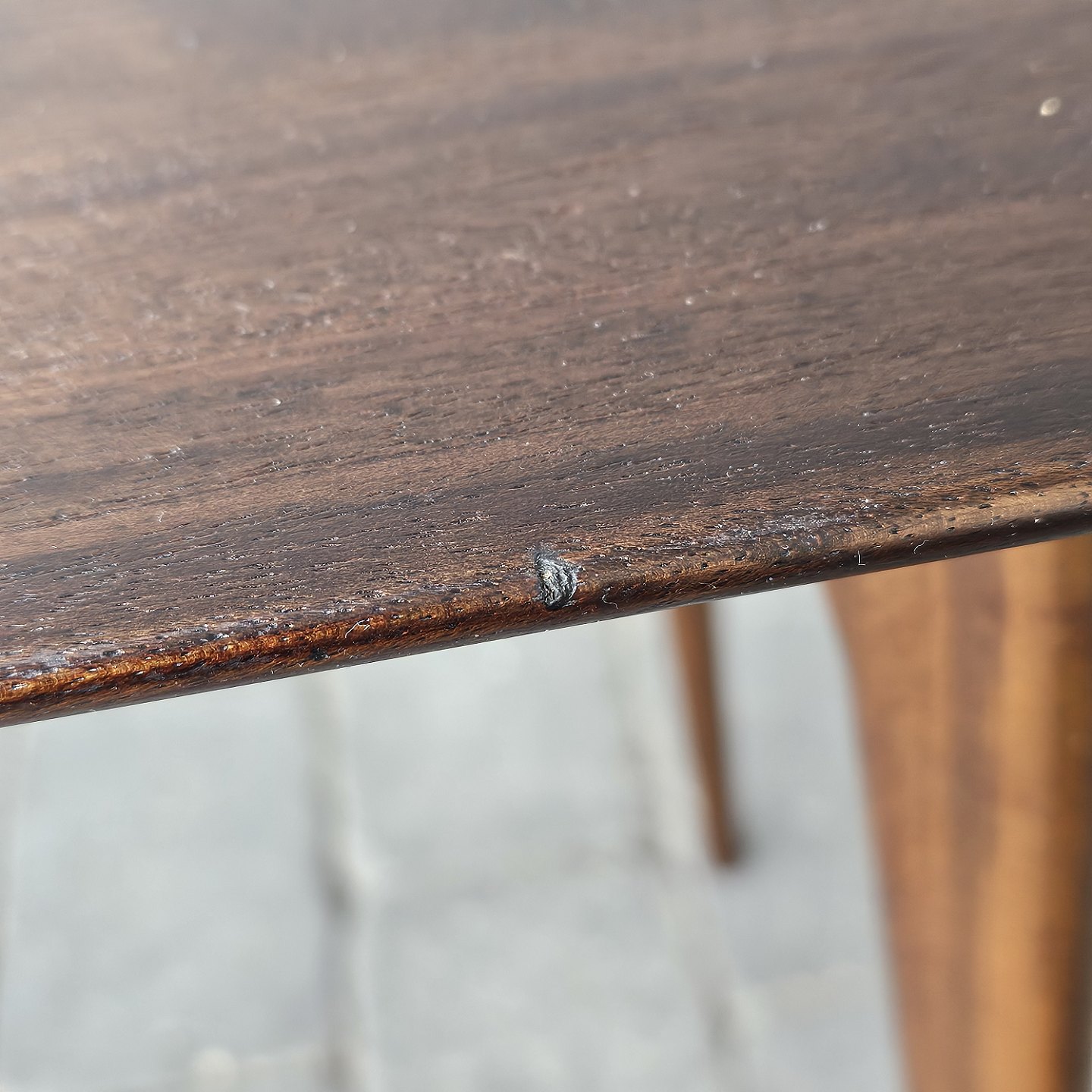 Fremstår med brugsspor i form af mærker i kanten og på undersiden af bordpladen