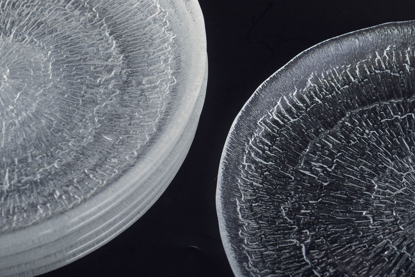 Sæt på seks tallerkener i presset klart glas fra serien Ultima Thule med karakteristisk, kraftigt struktureret overflade inspireret af smeltende is og arktiske landskaber. Uden mærkning.