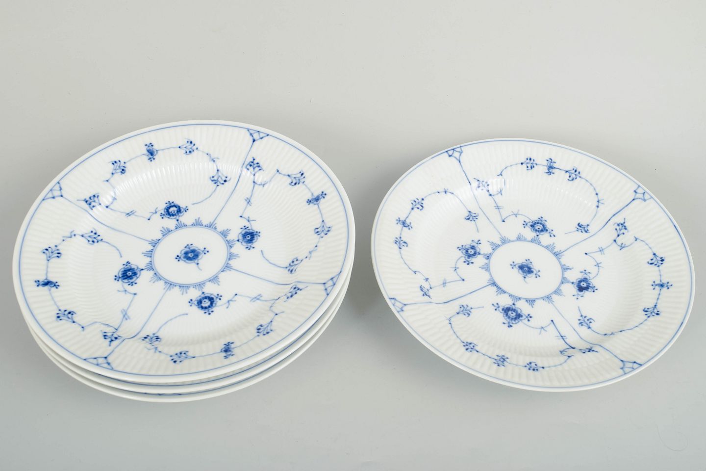Royal Copenhagen Musselmalet Riflet, sæt af fire middagstallerkener.