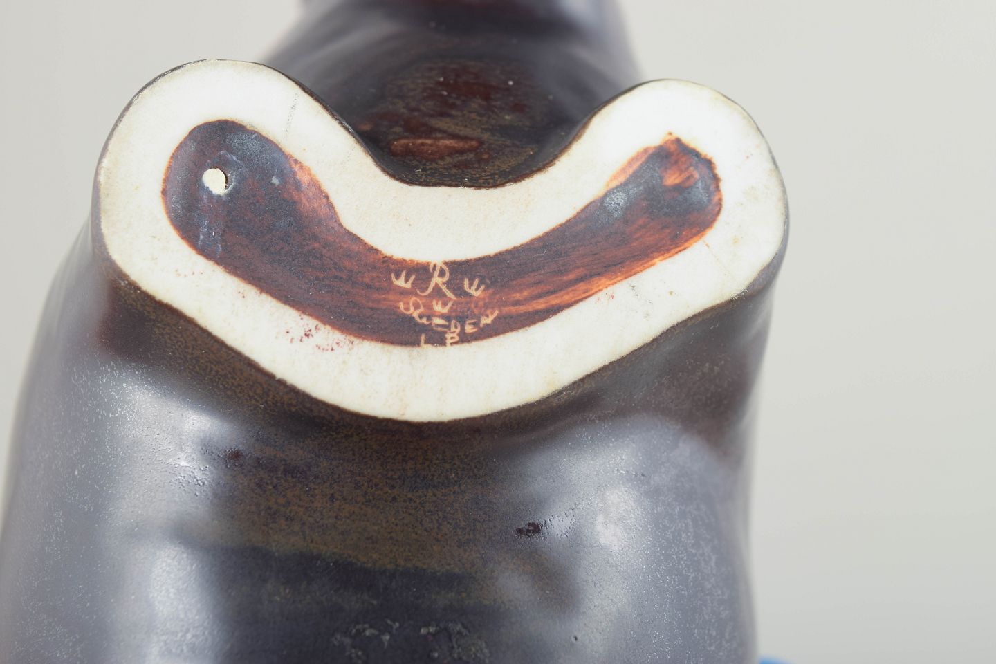 Kraftfuldt udformet tyr i mørk, matglaseret stentøj med kompakt, stiliseret form og markant volumen. Figuren er monteret på en oval træfod og fremstår med en enkel og modernistisk formgivning typisk for Rörstrands produktion i midten af det 20. århundrede. Første sortering.