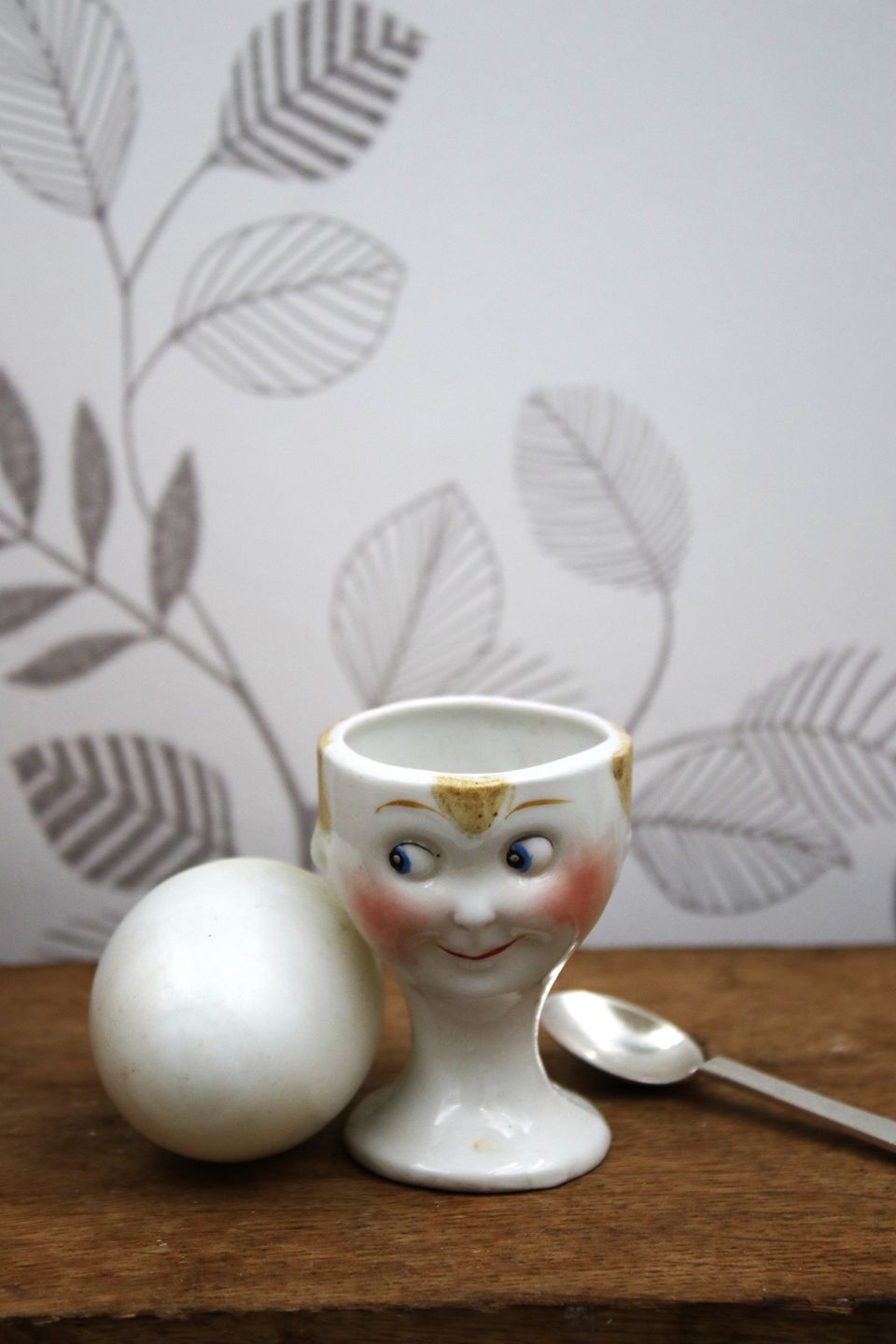 Gammelt æggebægre fra 30érne i porcelæn med bemalet sjovt ansigt.