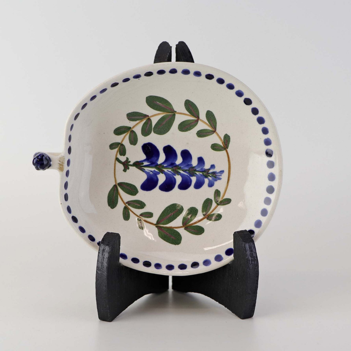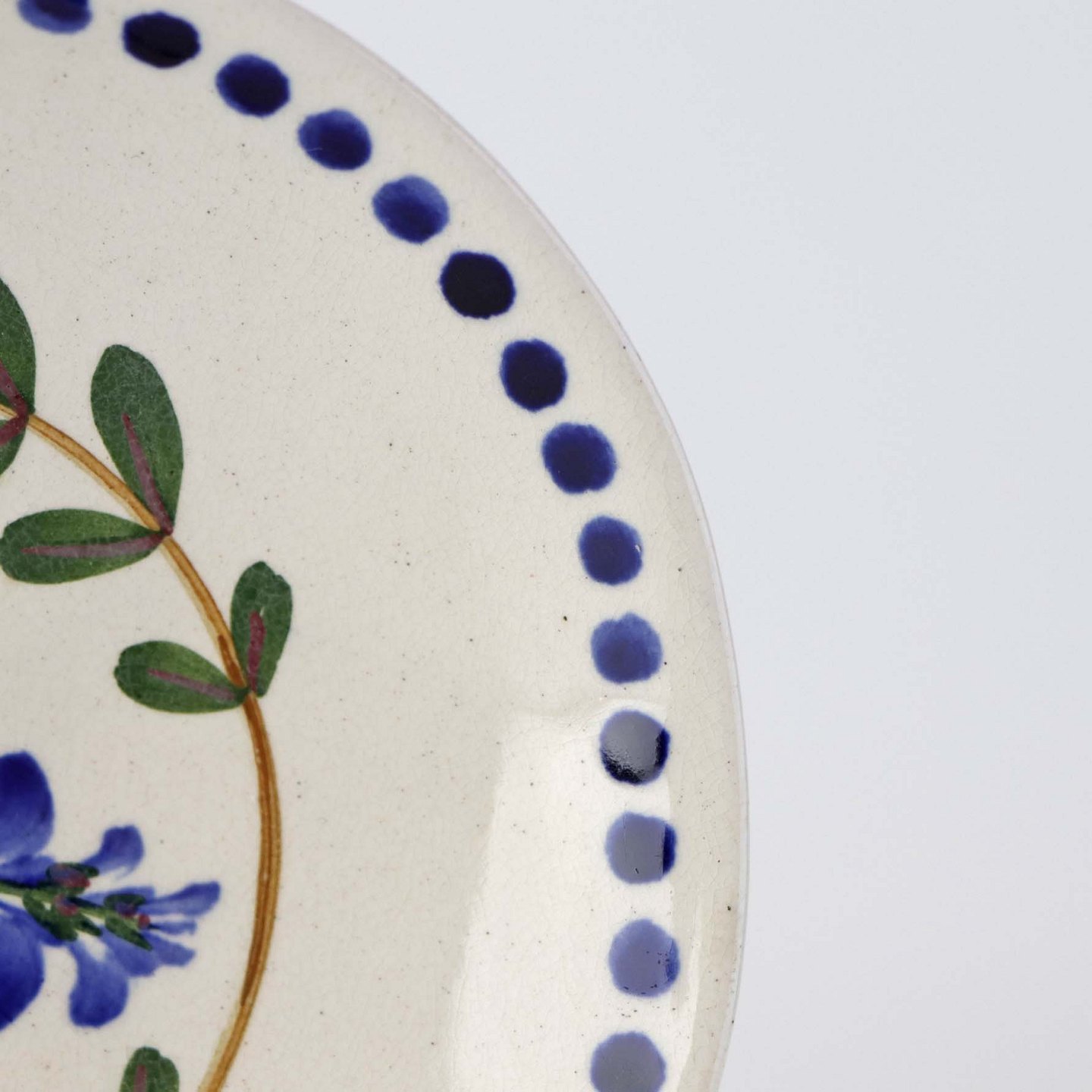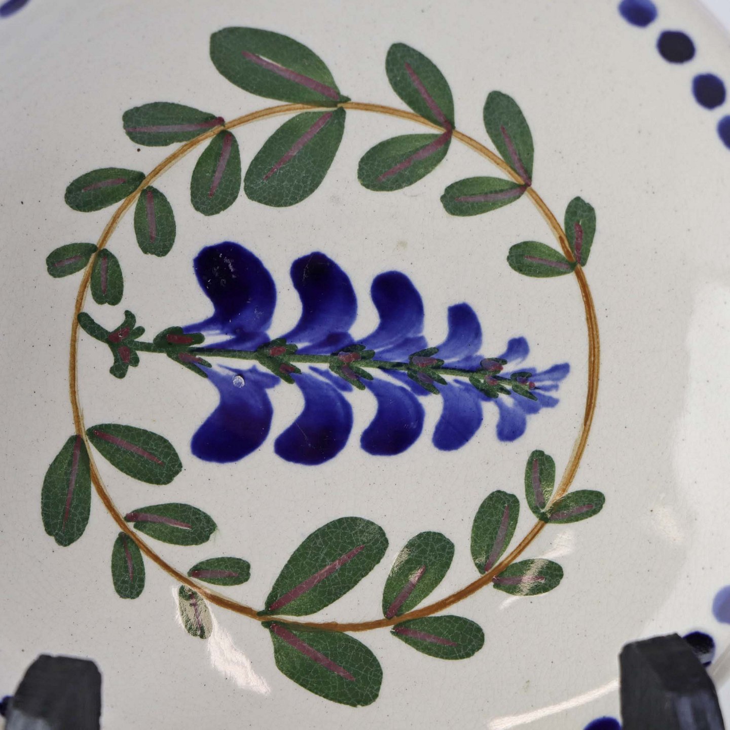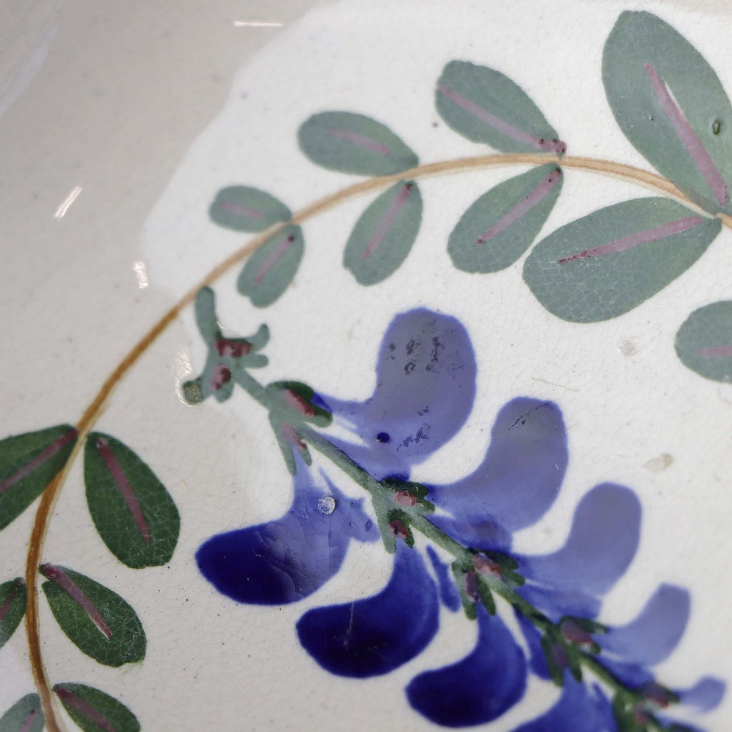Fajancestel med dekoration af ranker af blåregn og blade på lys baggrund afsluttet med kant af runde blå pletter.