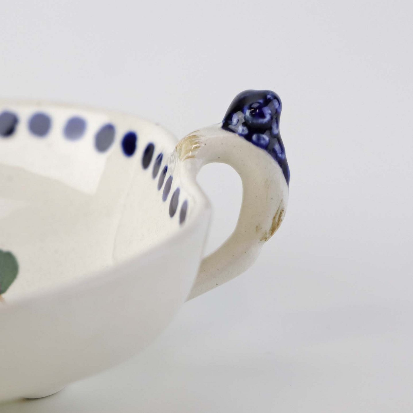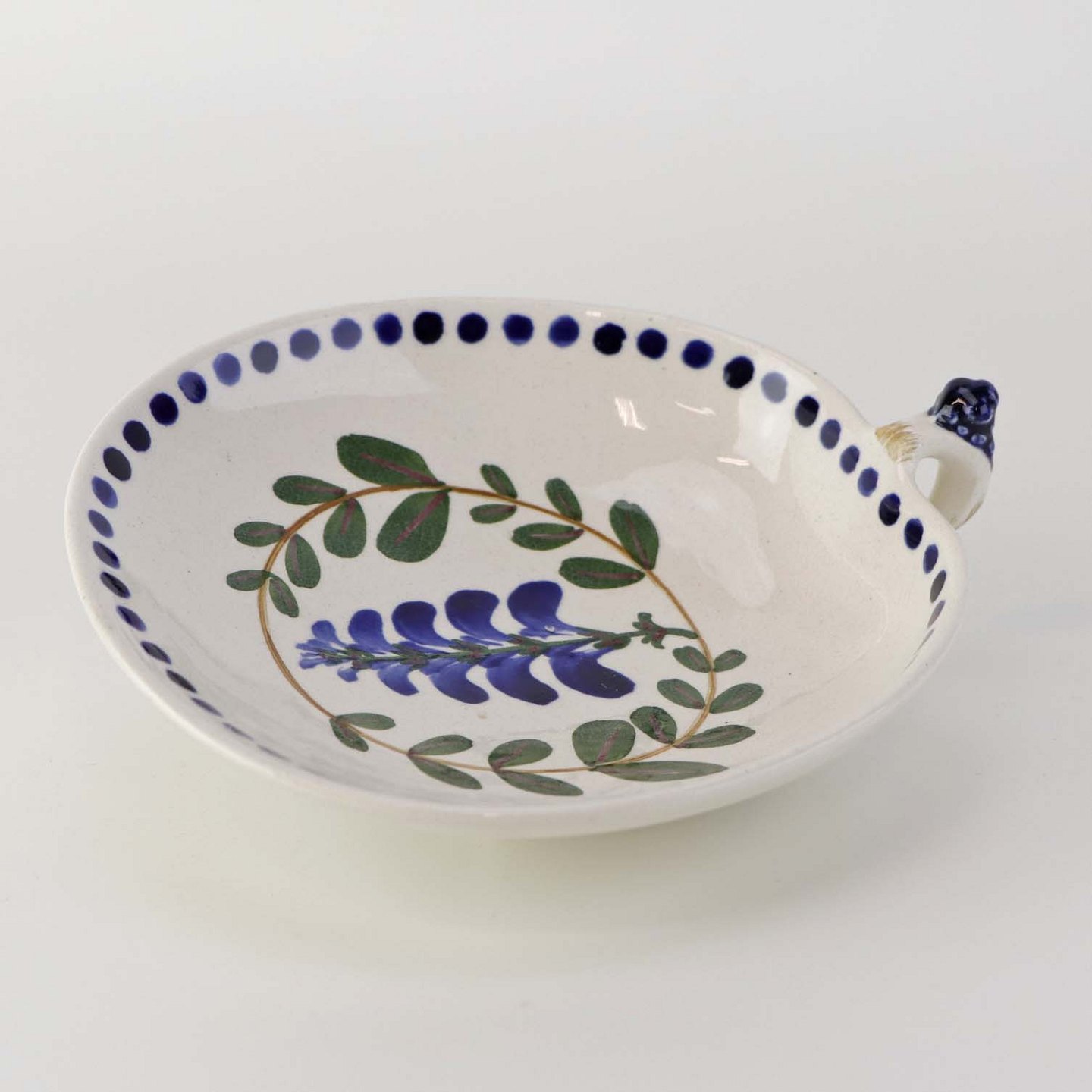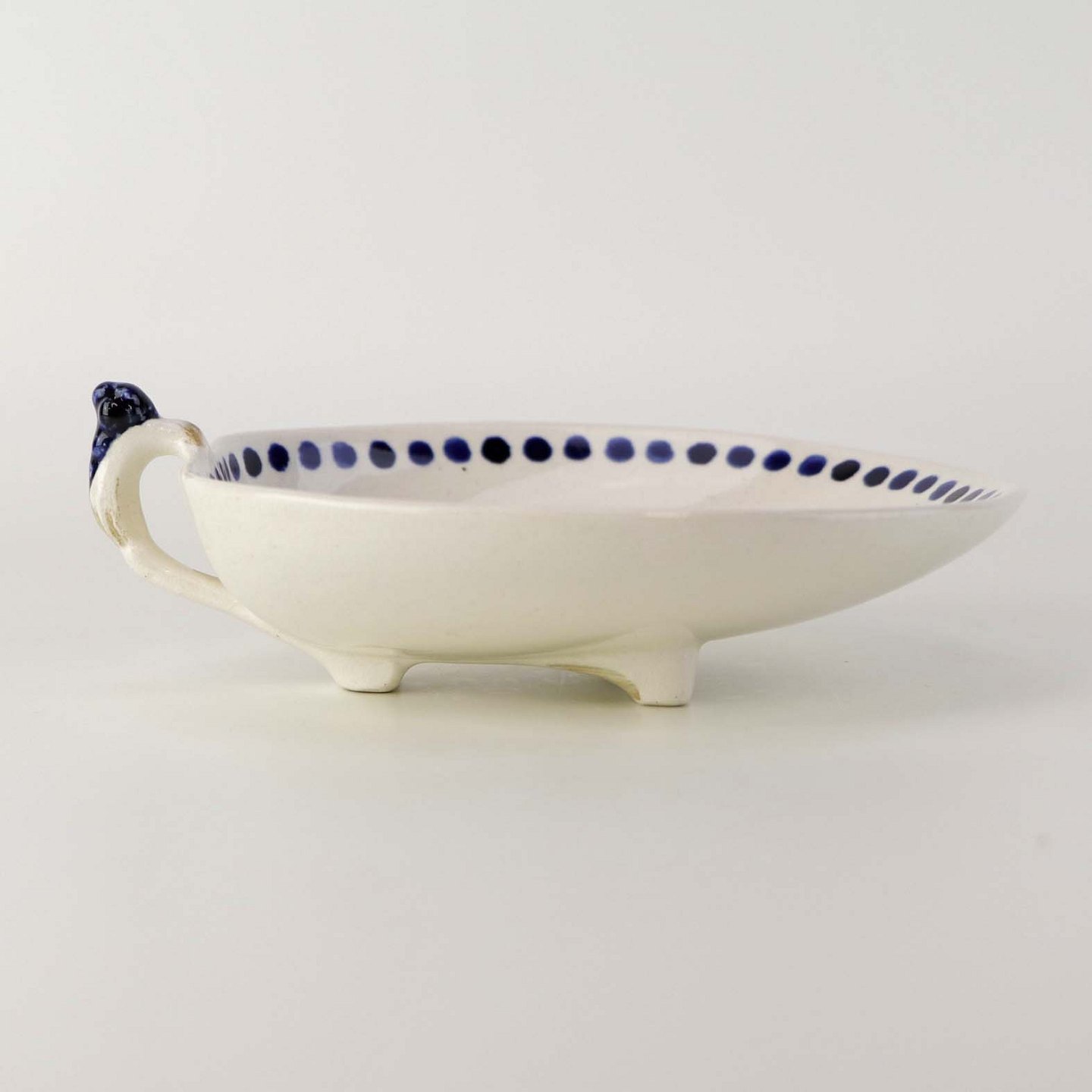 Lille asiet på fod og med hank i fajance fra stellet Blåregn. Stellet er fremstillet i perioden år 1903-1933. Nr. 522/187