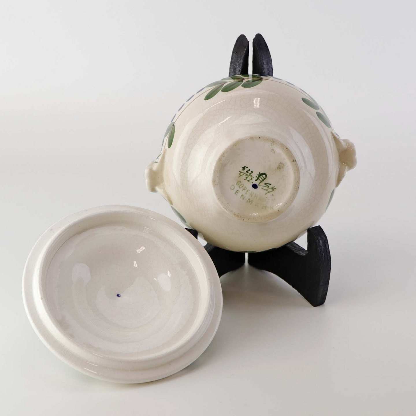 Fremstår med krakkeleringer i glasuren, samt lys brunering under glasuren på krukkens inderside.