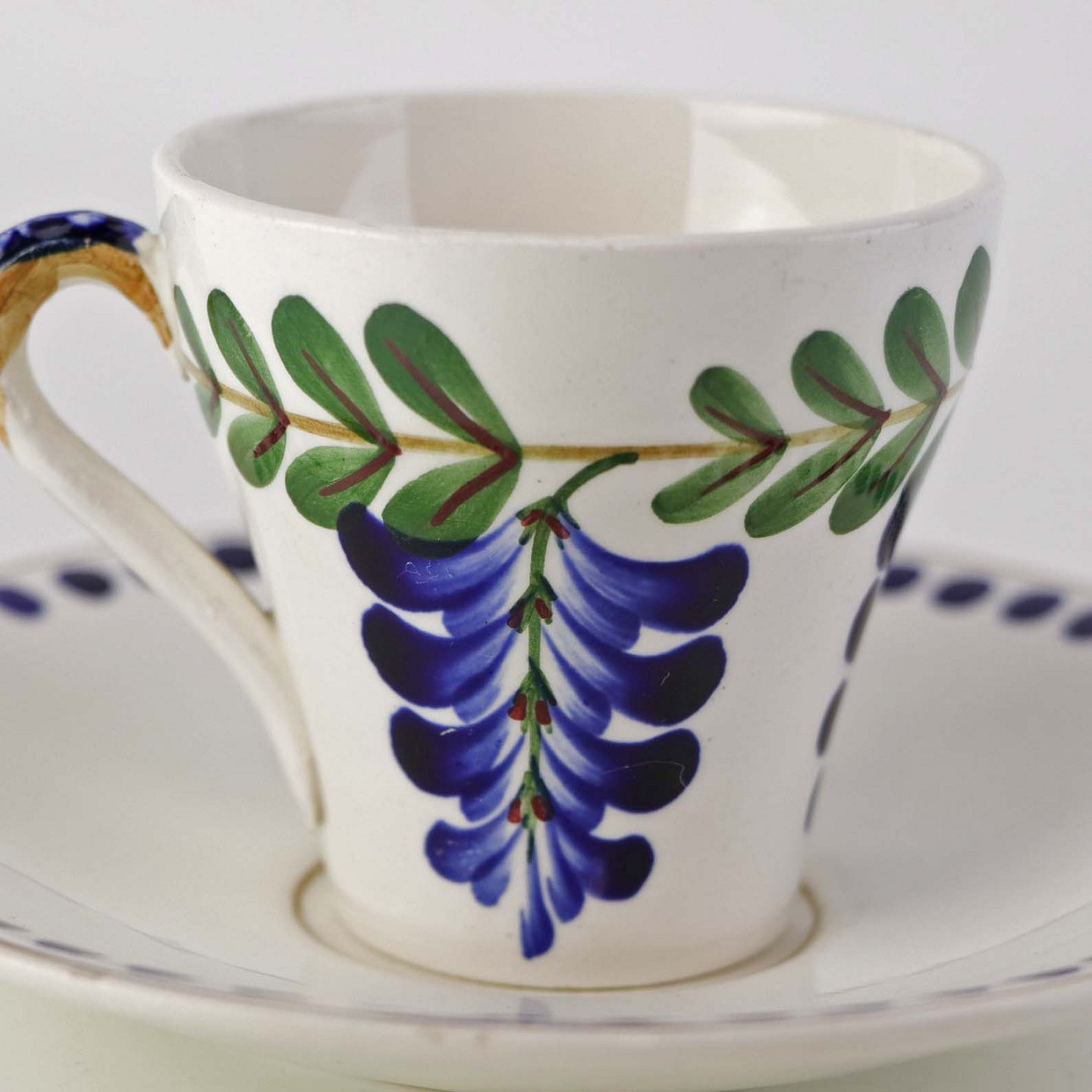 Fajancestel med dekoration af ranker af blåregn og blade på lys baggrund afsluttet med kant af runde blå pletter.