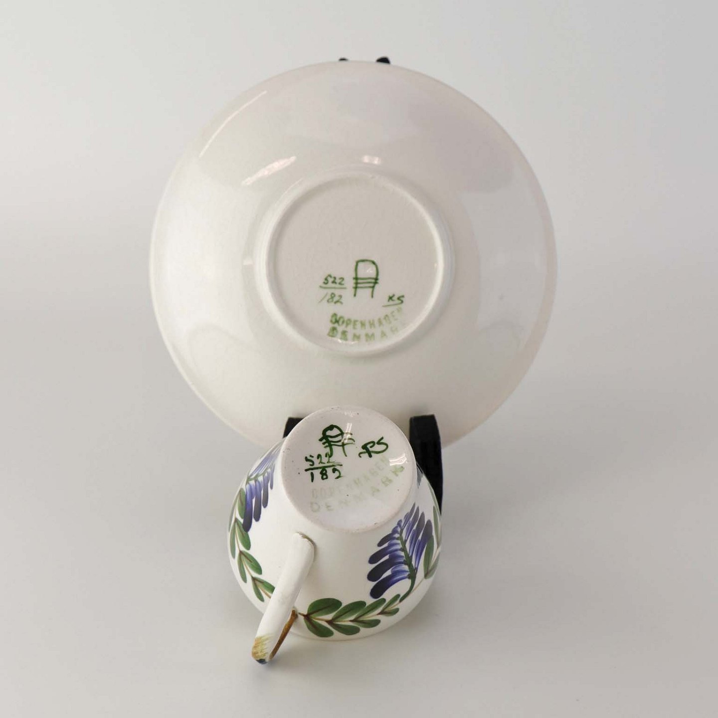 Text zugänglich auf Dänische: Lille kaffe eller moccakop med underkop i fajance fra stellet Blåregn. Stellet er fremstillet i perioden år 1903-1933. Nr. 522/182