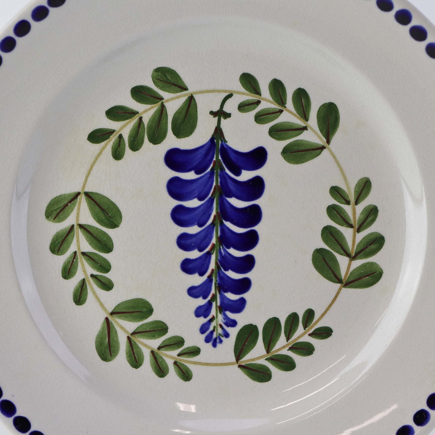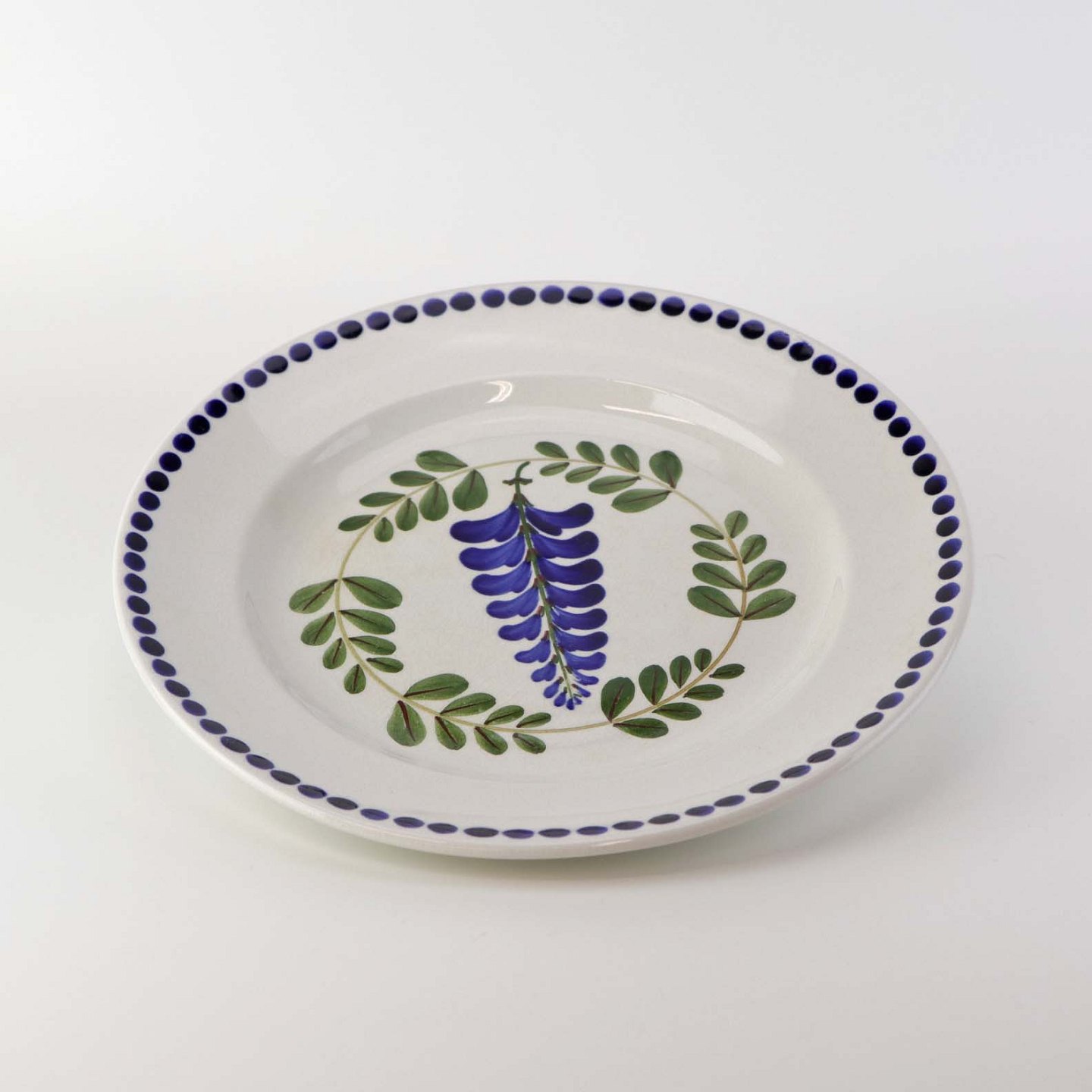Flad frokosttallerken i fajance fra stellet Blåregn. Stellet er fremstillet i perioden år 1903-1933. Nr. 522/1425