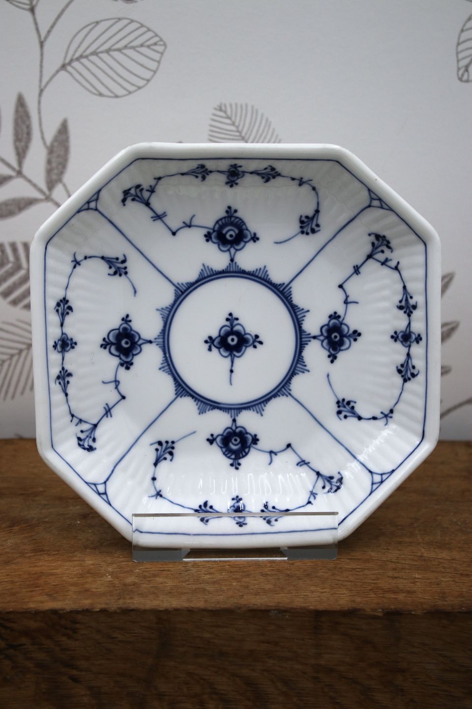 8 kantet sættefad i Musselmalet Riflet fra Royal Copenhagen. Dekorationsnummer: 1/230. 14,5x14,5cm. 1.sort. fra 1898-1923.