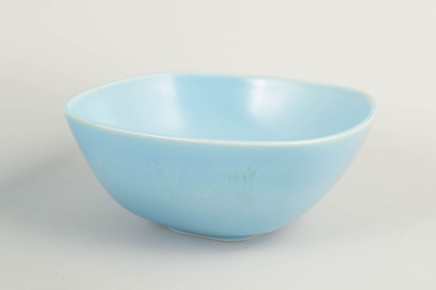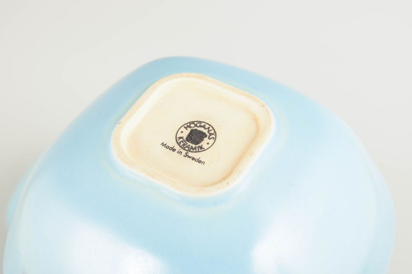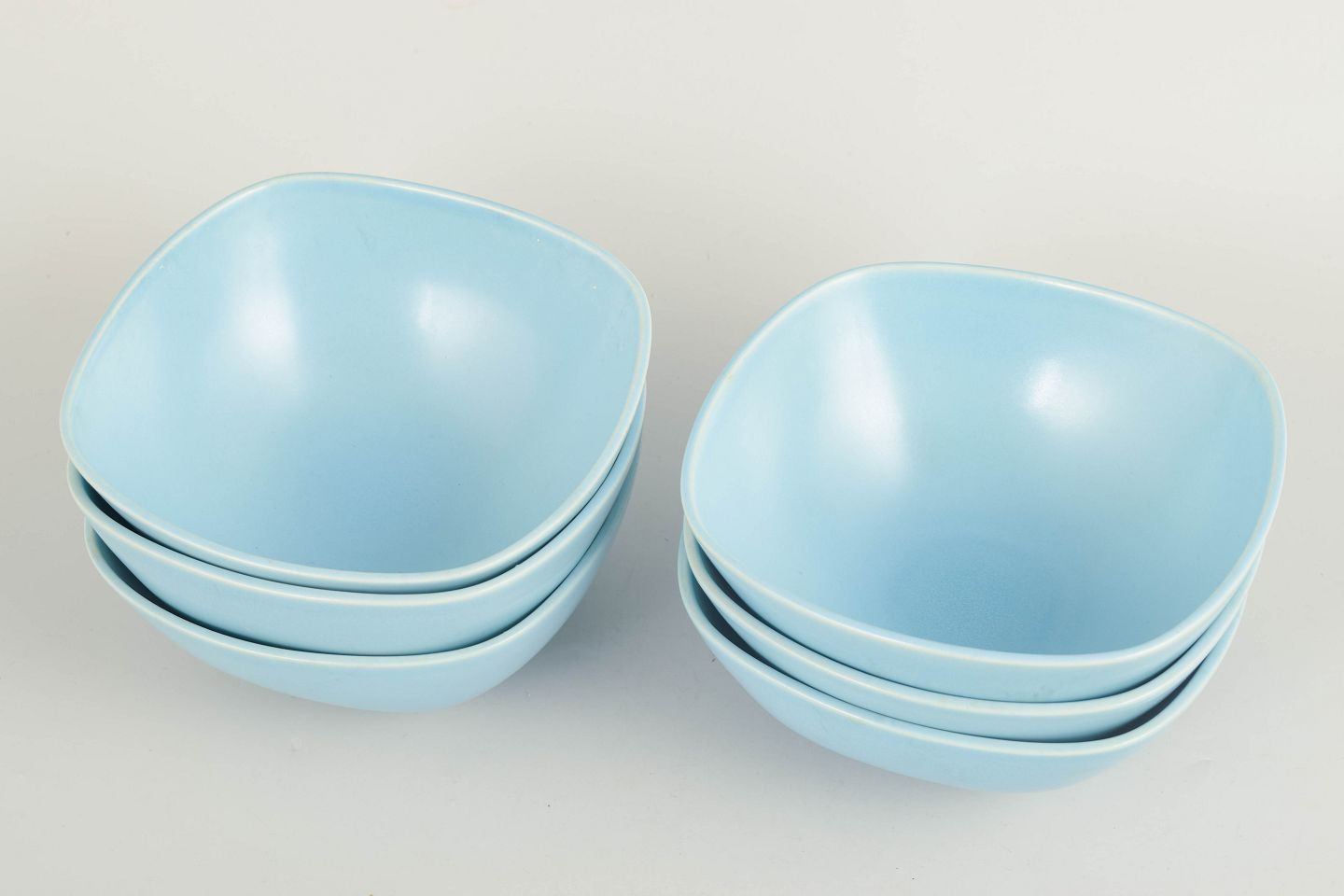 Sæt af seks skåle i stentøj med lyseblå glasur og enkle funktionelle former. Stemplet Höganäs Keramik, Made in Sweden.