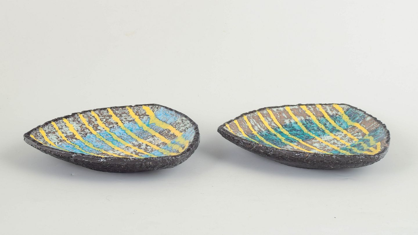 To mindre ovale keramikfade model 2548, udført i stentøj med reliefdekoration og flerfarvet glasur i blå og gule nuancer.