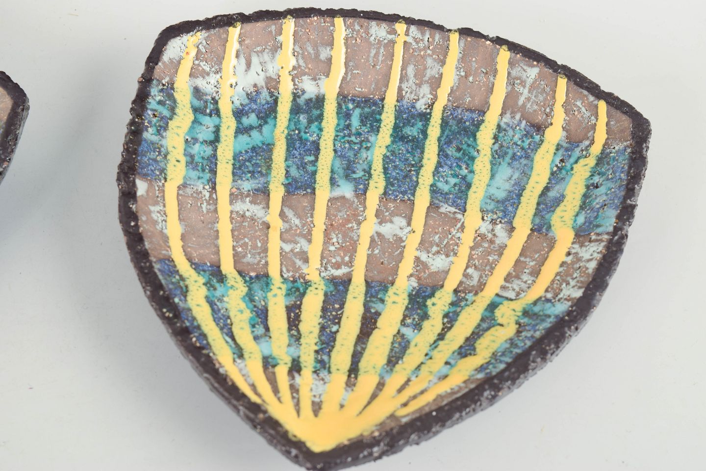 To mindre ovale keramikfade model 2548, udført i stentøj med reliefdekoration og flerfarvet glasur i blå og gule nuancer.