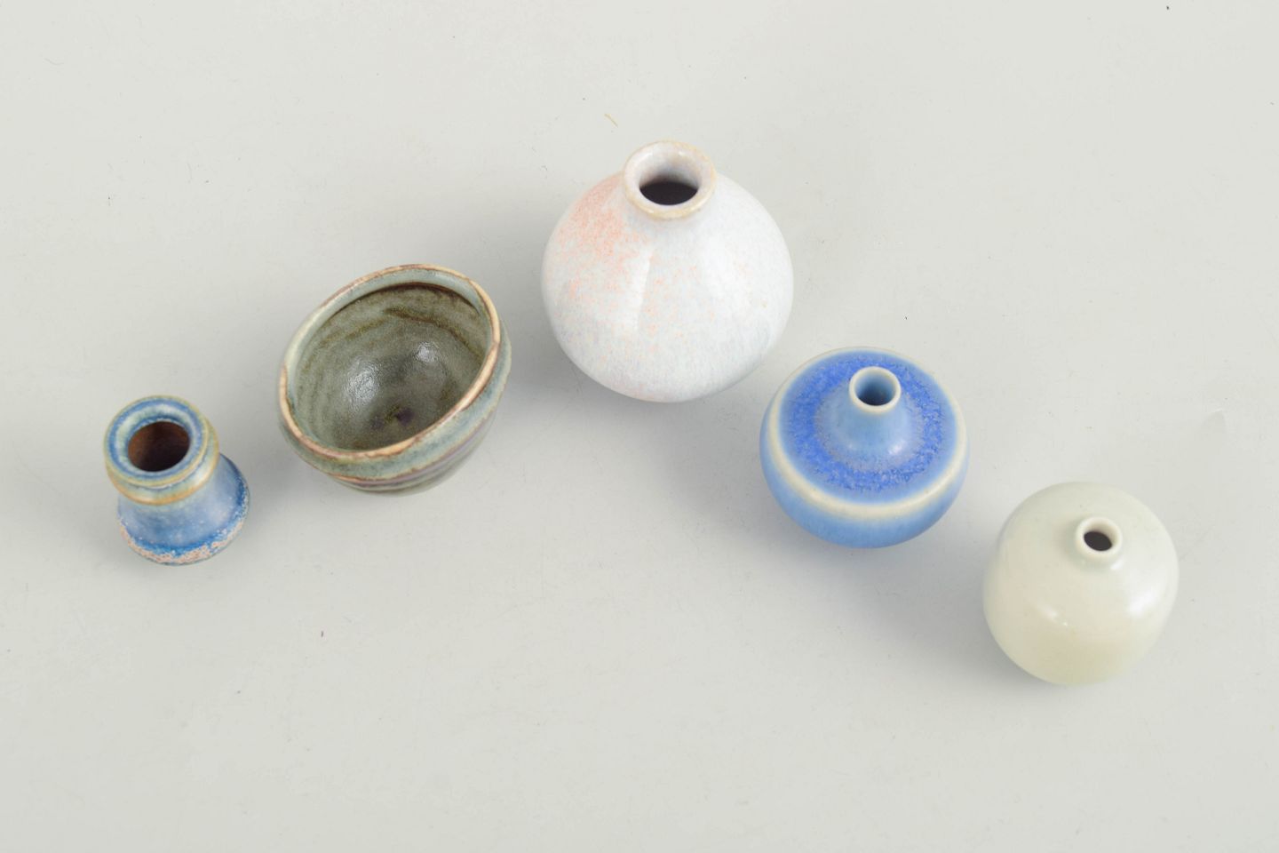Samling af fem miniature keramikgenstande bestående af små skåle og vaser i forskellige former og glasurer. Fremstillet i keramik med flerfarvede glasurer i blå, grønne og lyse nuancer. Tre eksemplarer er fra Höganäs og andre fra forskellige producenter, herunder et umærket eksemplar.