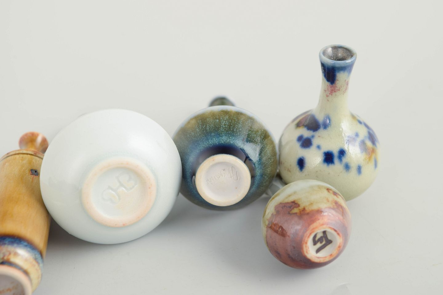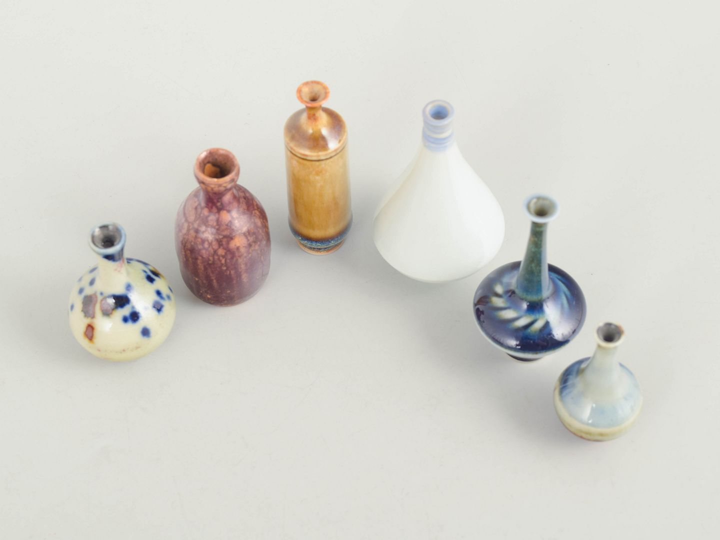 Samling af seks miniature keramikvaser i forskellige former og glasurer. Fremstillet i keramik med flerfarvede glasurer i blå, brune og lyse nuancer. Alle eksemplarer er mærket i bunden. Eksemplarer er fra Höganäs og andre fra forskellige producenter.