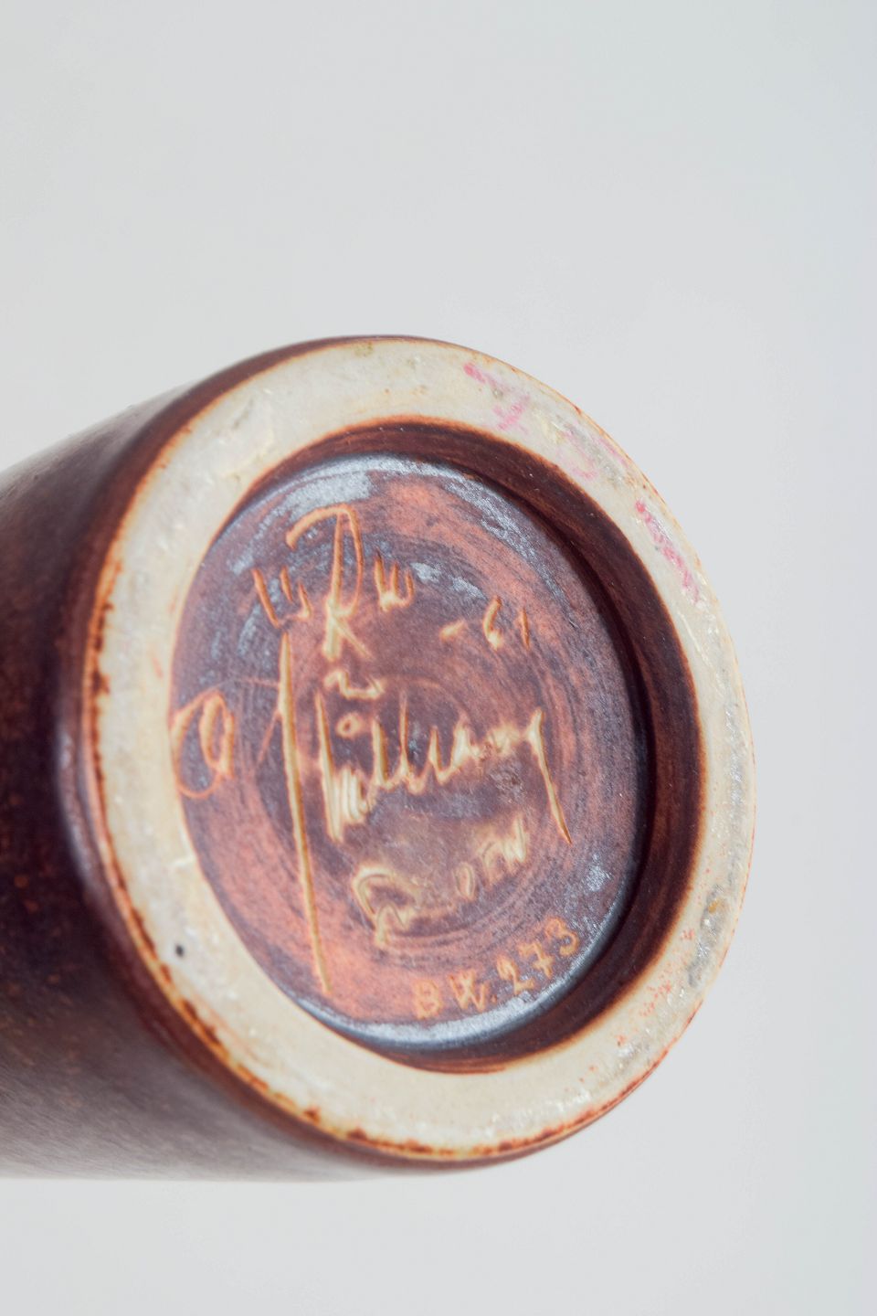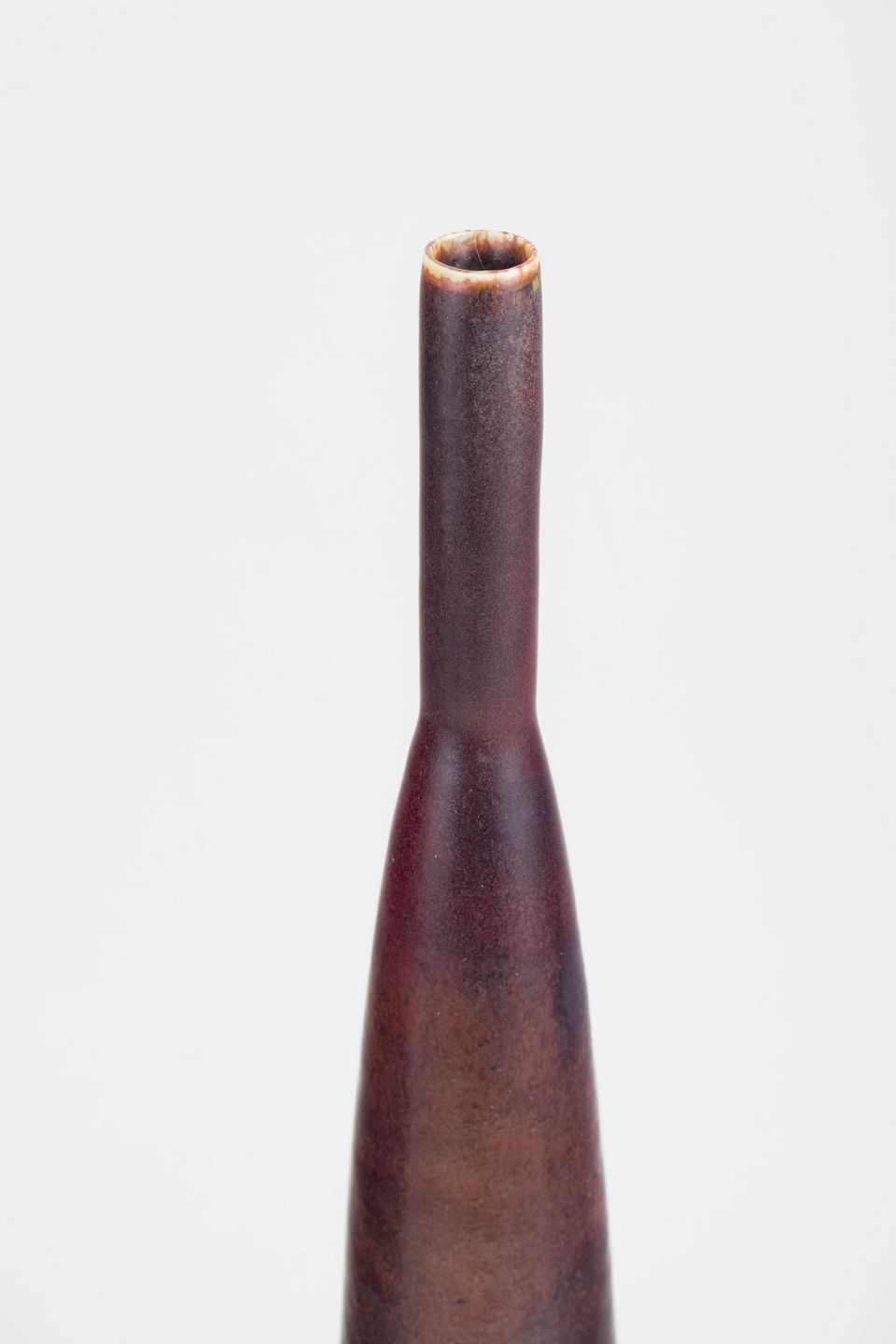 Stor slank drejet vase i stentøj med brun nuanceret glasur. Unik udførelse fra Rörstrand, signeret CHS og dateret 1961. Første sortering.