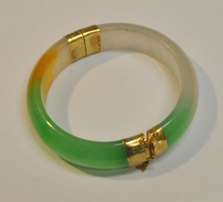 Chinesisches Jade-Armband, 20. Jahrhundert. Mit Verschluss aus 8-karätigem Rotgold. Innendurchmesser: 6,2 cm. Außendurchmesser: 8 cm.