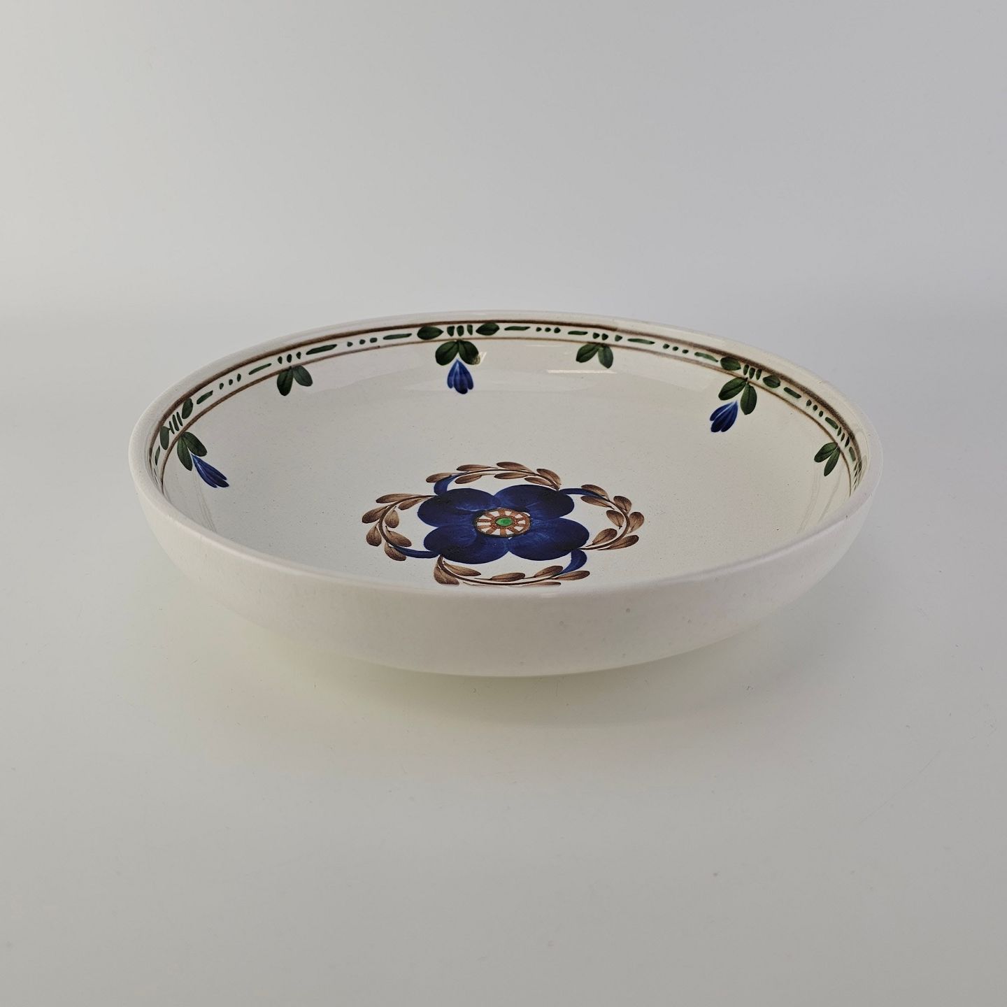 Rundt fad i kunstfajance med dekoration af blå blomster