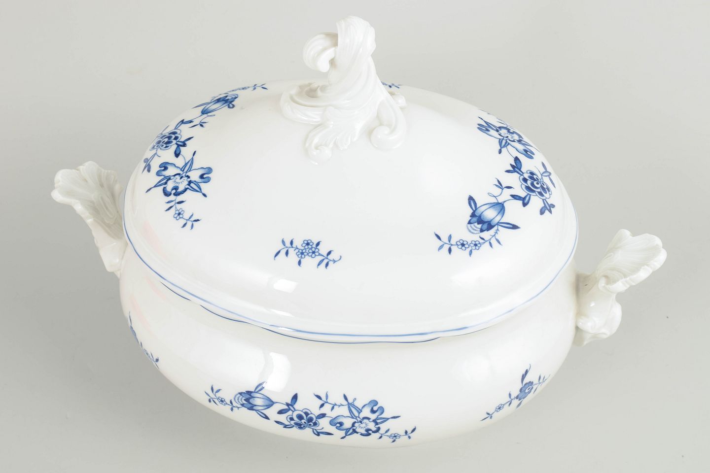 Stor suppeterrin i håndmalet porcelæn med Blå Orkidé dekoration. Fremstillet hos Meissen og mærket med Meissens krydssværd. Annulleret med to indridsede streger under bunden.