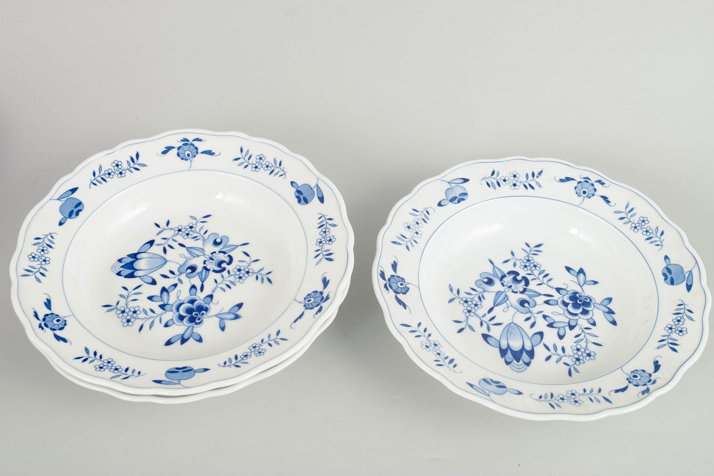Sæt af tre dybe tallerkener i håndmalet porcelæn med Blå Orkidé dekoration. Fremstillet hos Meissen og mærket med Meissen krydssværd. Annulleret med to indridsede streger under bunden.