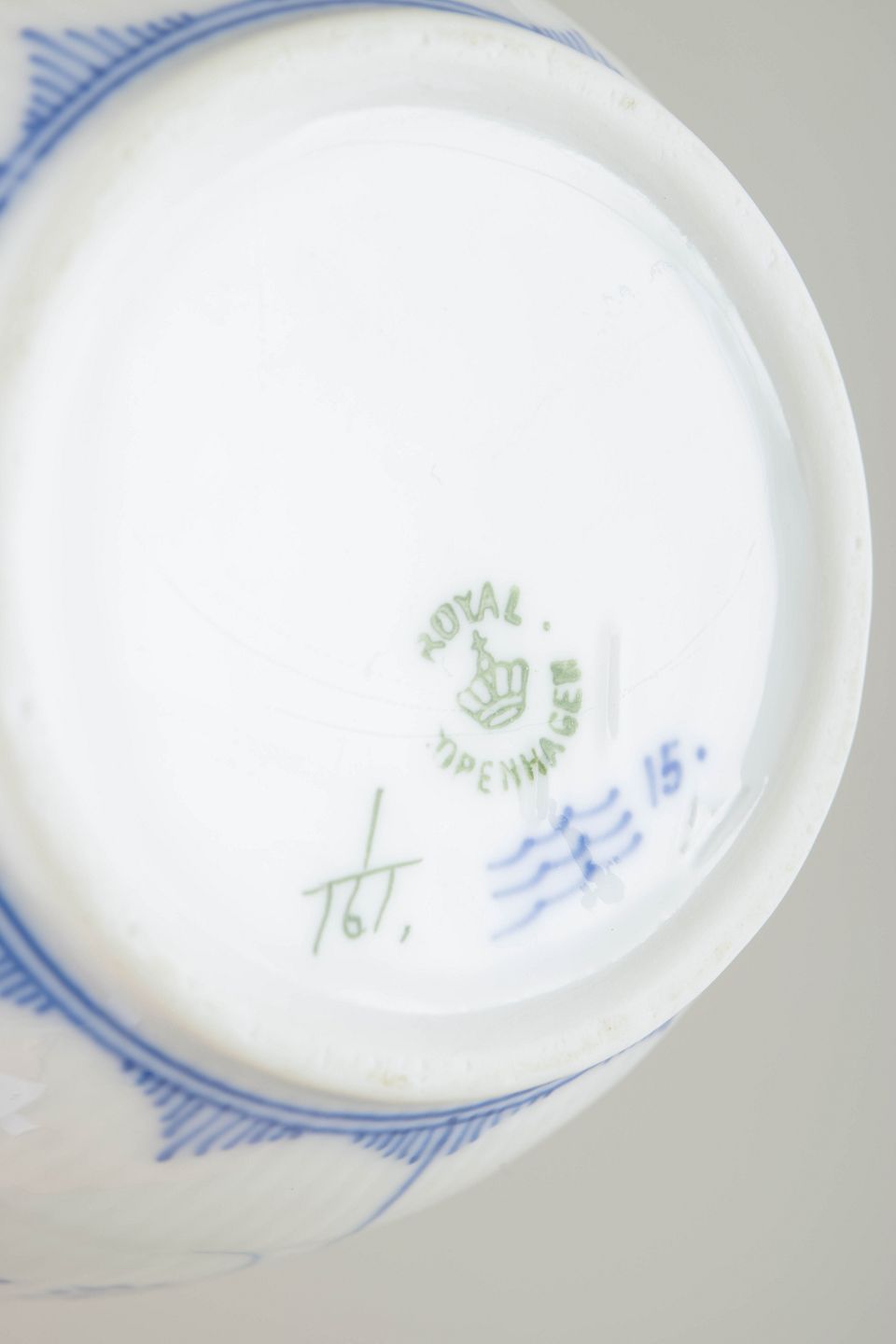 Kande i håndmalet porcelæn fra Musselmalet Riflet med klassisk underglasurdekoration i koboltblå og riflede felter. Model 1/161. Annulleret med én indridset streg under bunden. Fremstillet i 1920’erne.
