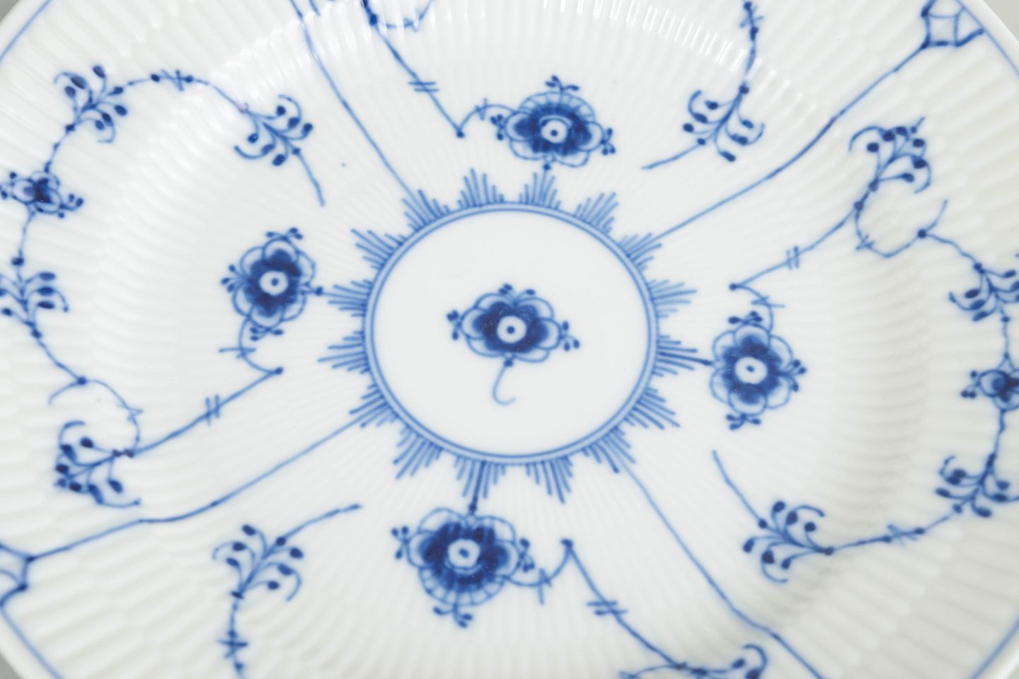 Sæt af seks tallerkener i håndmalet porcelæn fra Musselmalet Riflet med klassisk underglasurdekoration i koboltblå og riflede felter.