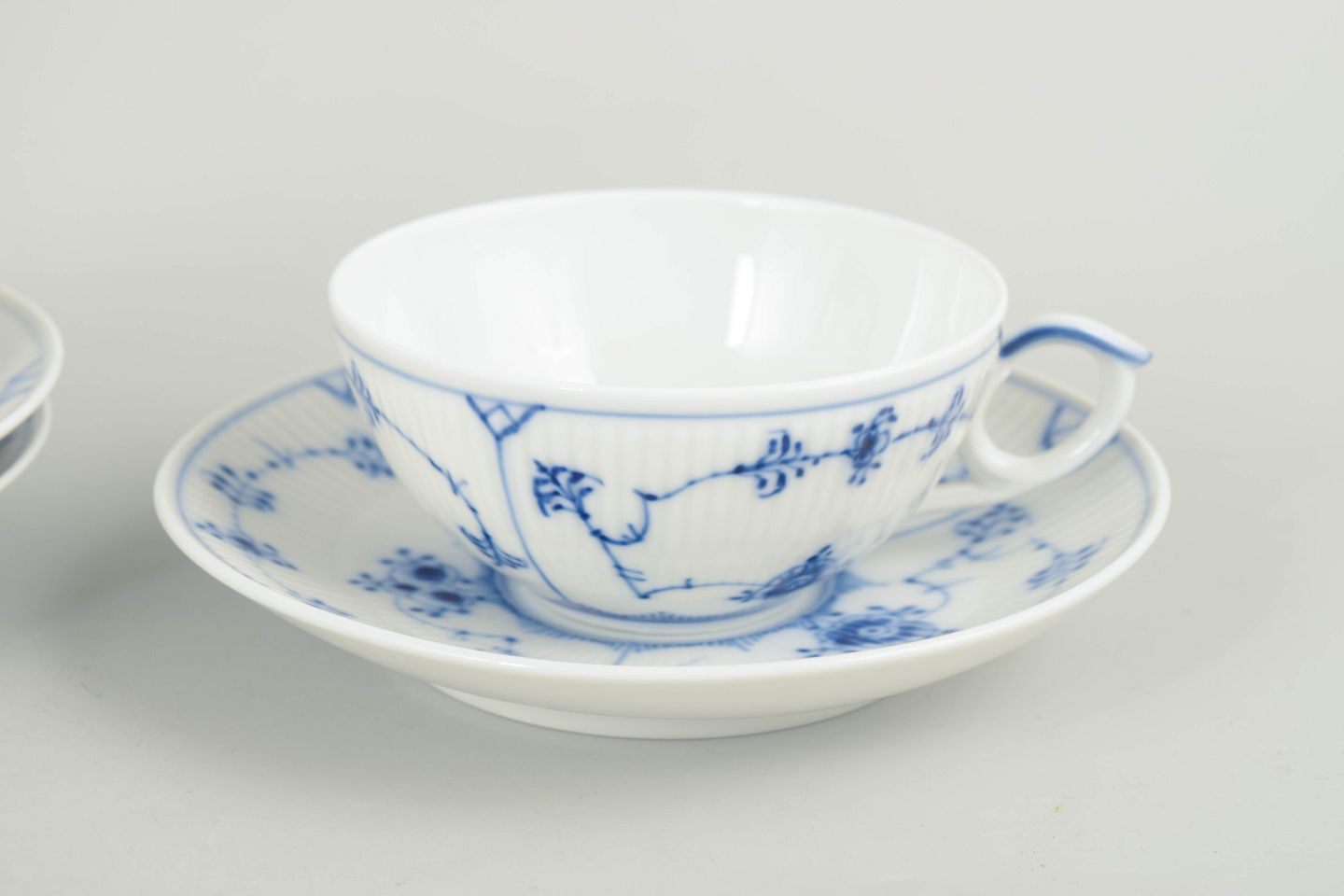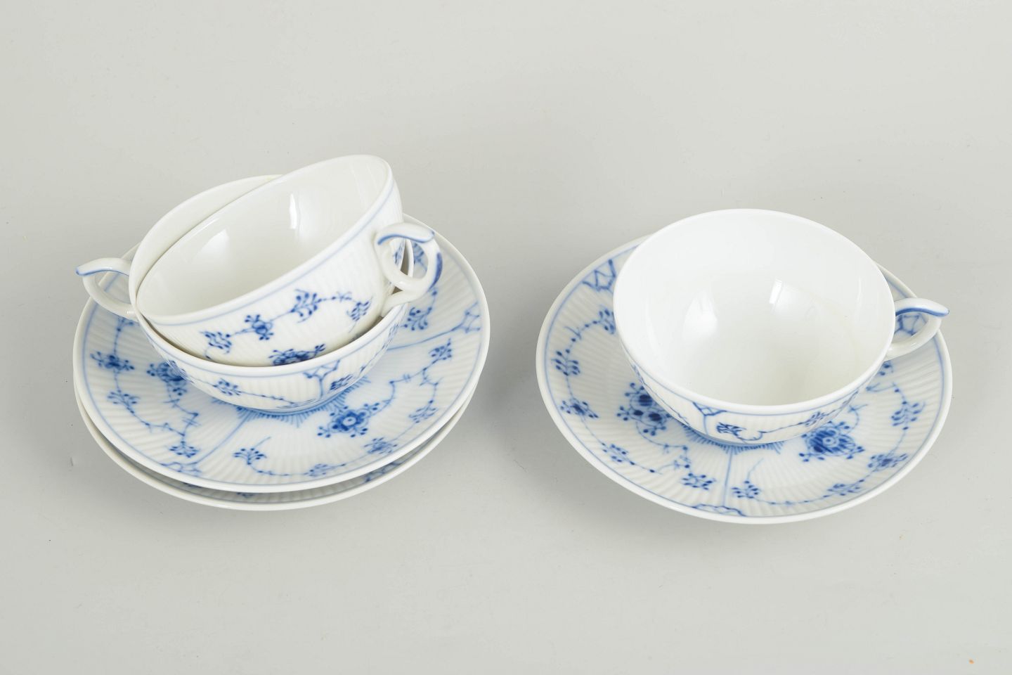 Sæt af tre tekopper med tilhørende underkopper i håndmalet porcelæn fra Musselmalet Riflet med klassisk underglasurdekoration i koboltblå og riflede felter. Model 1/76. Kopper H. 5 cm, D. 12 cm. Underkopper D. 15 cm. Første sortering. Fremstillet i 1960/80’erne.
