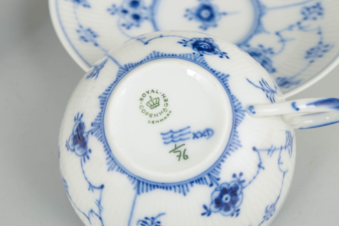 Royal Copenhagen blev grundlagt i 1775 i København under kongelig bevilling. Fabrikken er internationalt anerkendt for sit håndmalede porcelæn og sit høje kunstneriske niveau. Musselmalet Riflet er fabrikkens mest klassiske stel, introduceret i slutningen af 1700-tallet og fortsat produceret med traditionel håndmalingsteknik.
