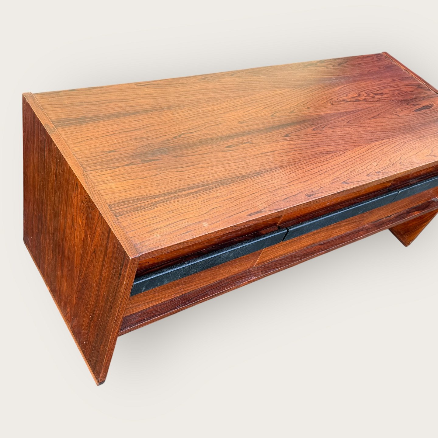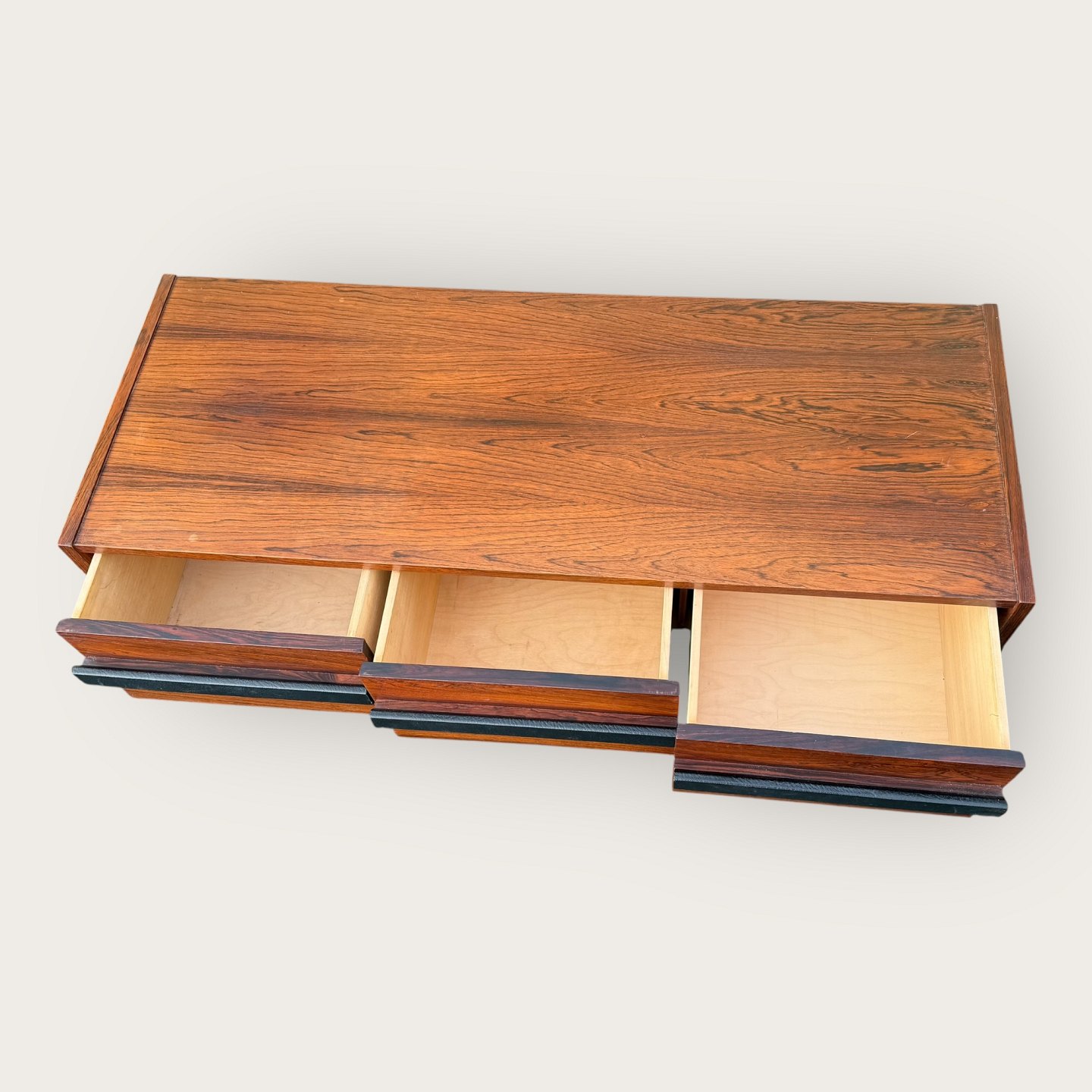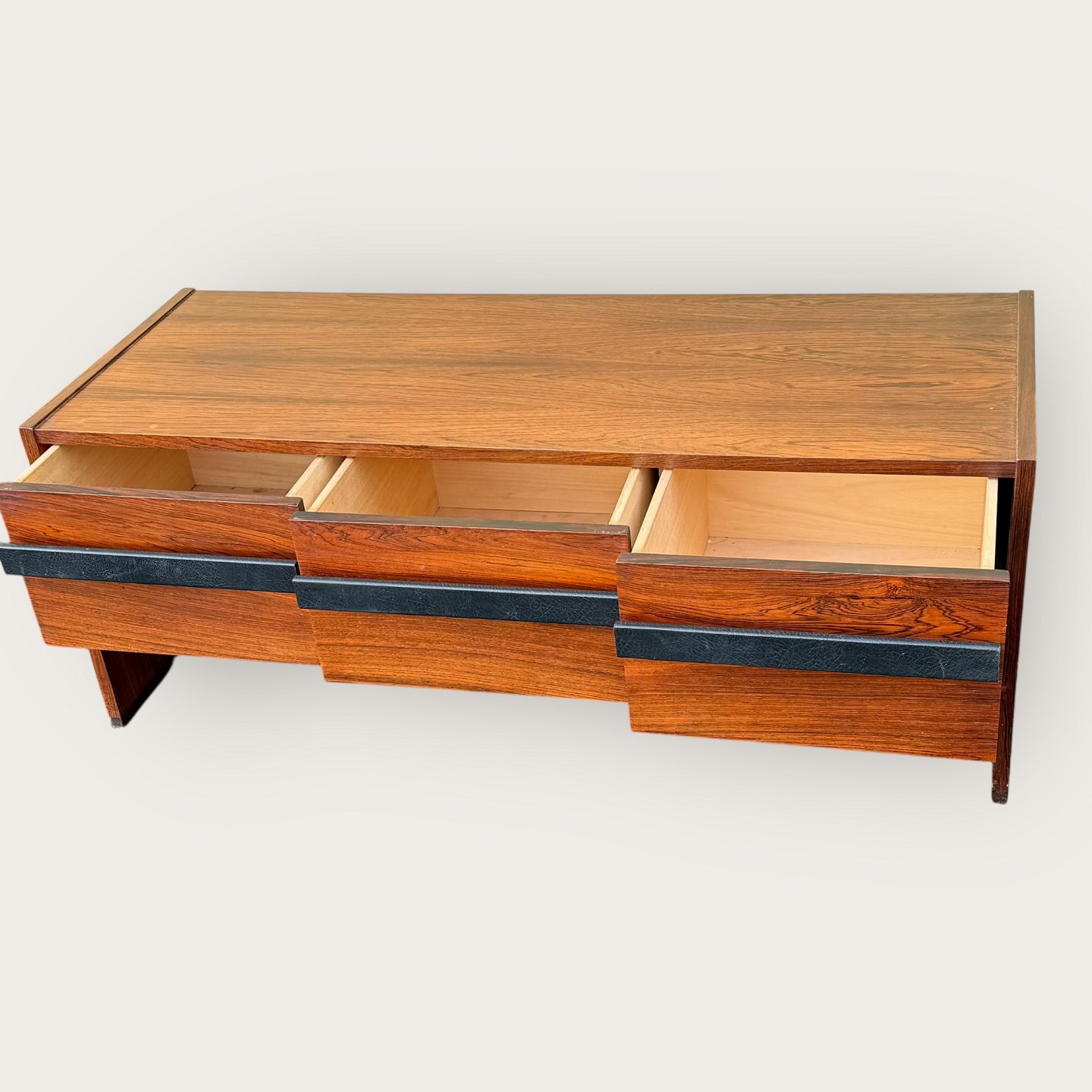 | Niedriges Sideboard aus Palisanderfurnier, drei Schubladen mit lederbezogenen Griffen, nicht mehr im Sortiment von Illums Bolighus, Maße: H x B x T 46 x 116 x 45 cm, bildete zusammen mit dem Palisanderspiegel (Artikelnummer 632831) ein großes Flur-Ensemble. *In gutem, gebrauchtem Zustand mit wenigen Gebrauchsspuren.*