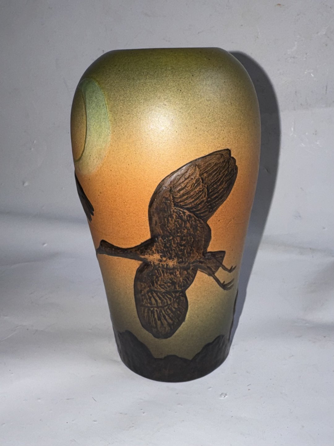 Vase i keramik fra den københavnske lervarefabrik Peter Ipsen ca. 1925. Dekoreret med en stor flyvende fugl. I god stand. Lille “nålestik” på bundens kant (se foto). Fabriksmærket på bunden med P. Ipsen Enke logo (krone over PIE) samt modelnummer 647. H. 14,7 cm.