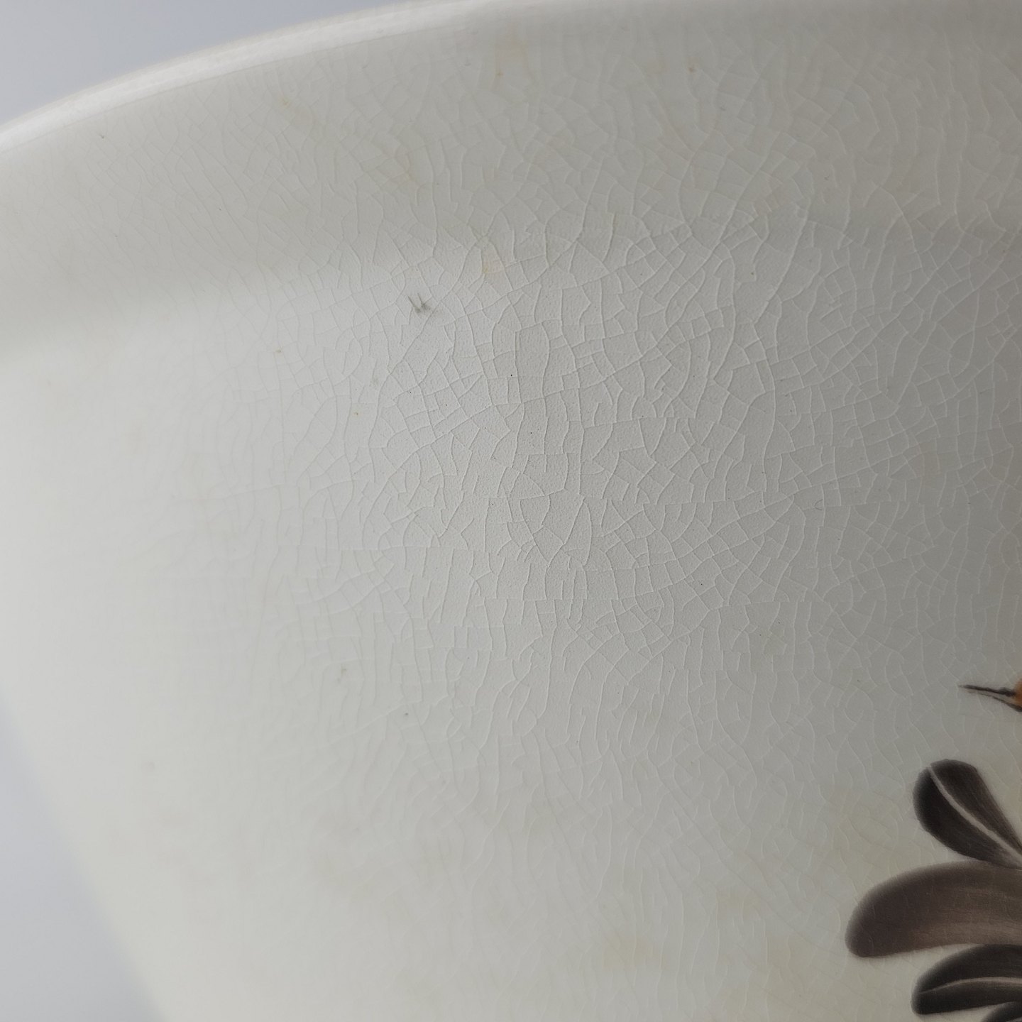 Hvidt fajancestel i stelform G med motiv af en orange og brun fugl og kant.