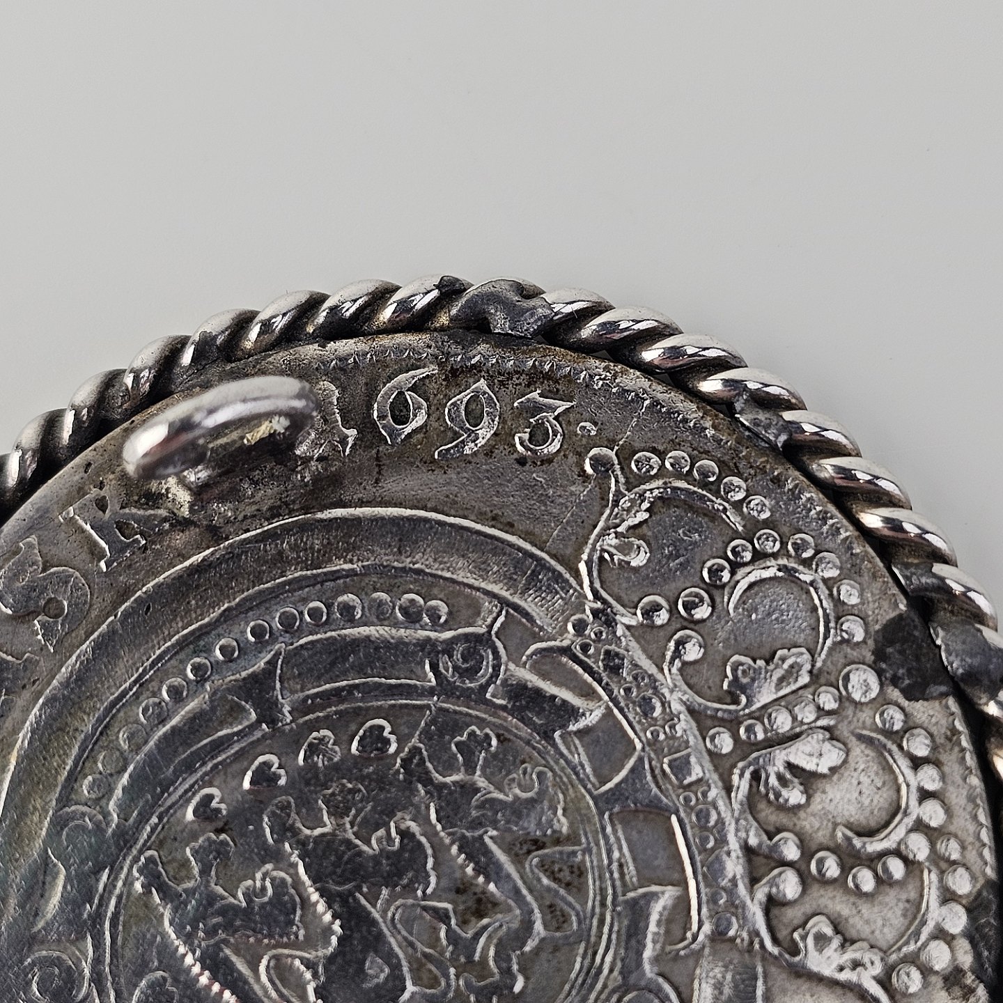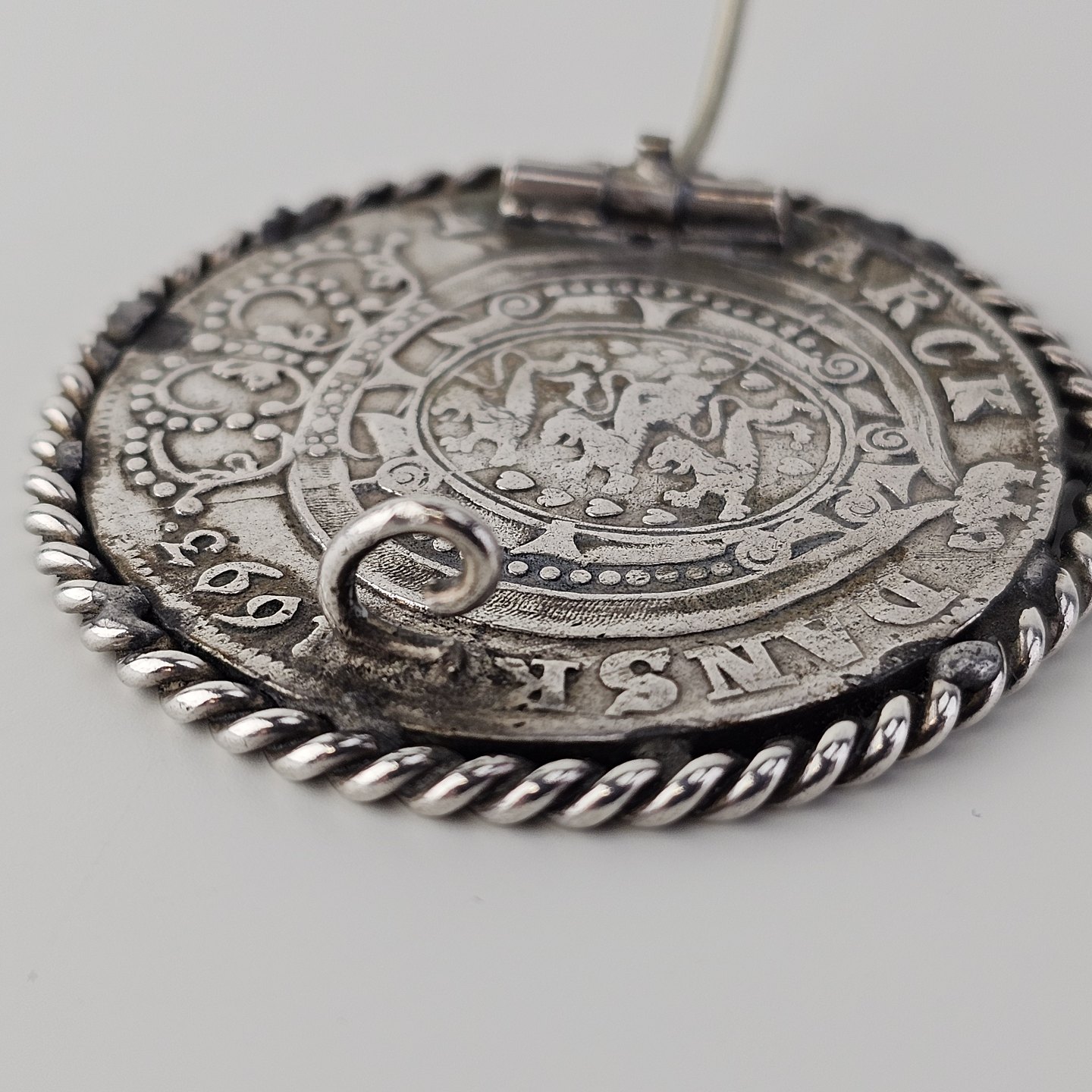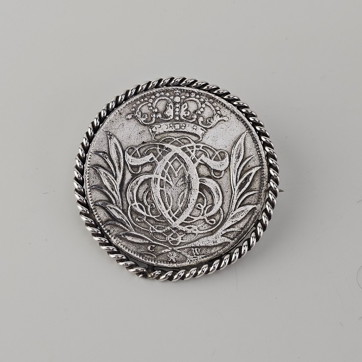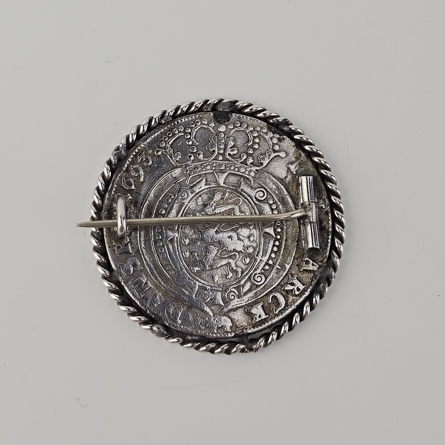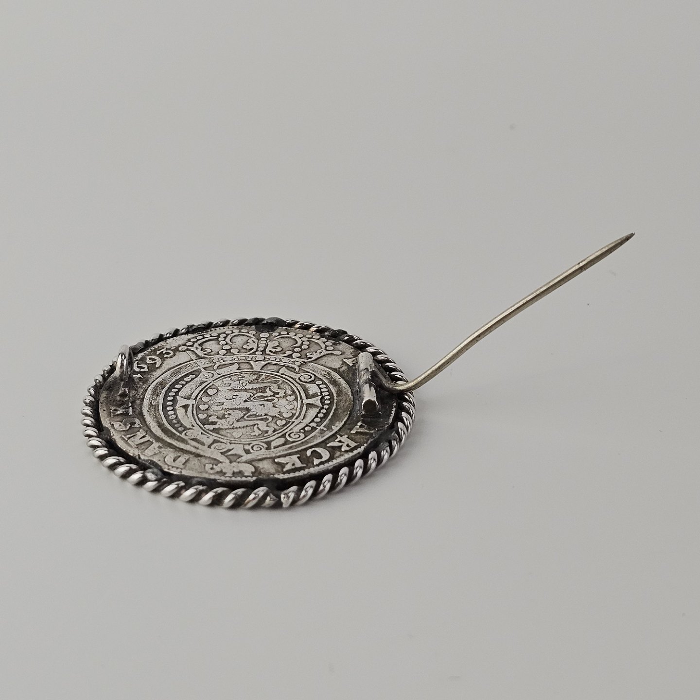 Broche af en dansk sølvmønt slået i 1693 i Glückstadt