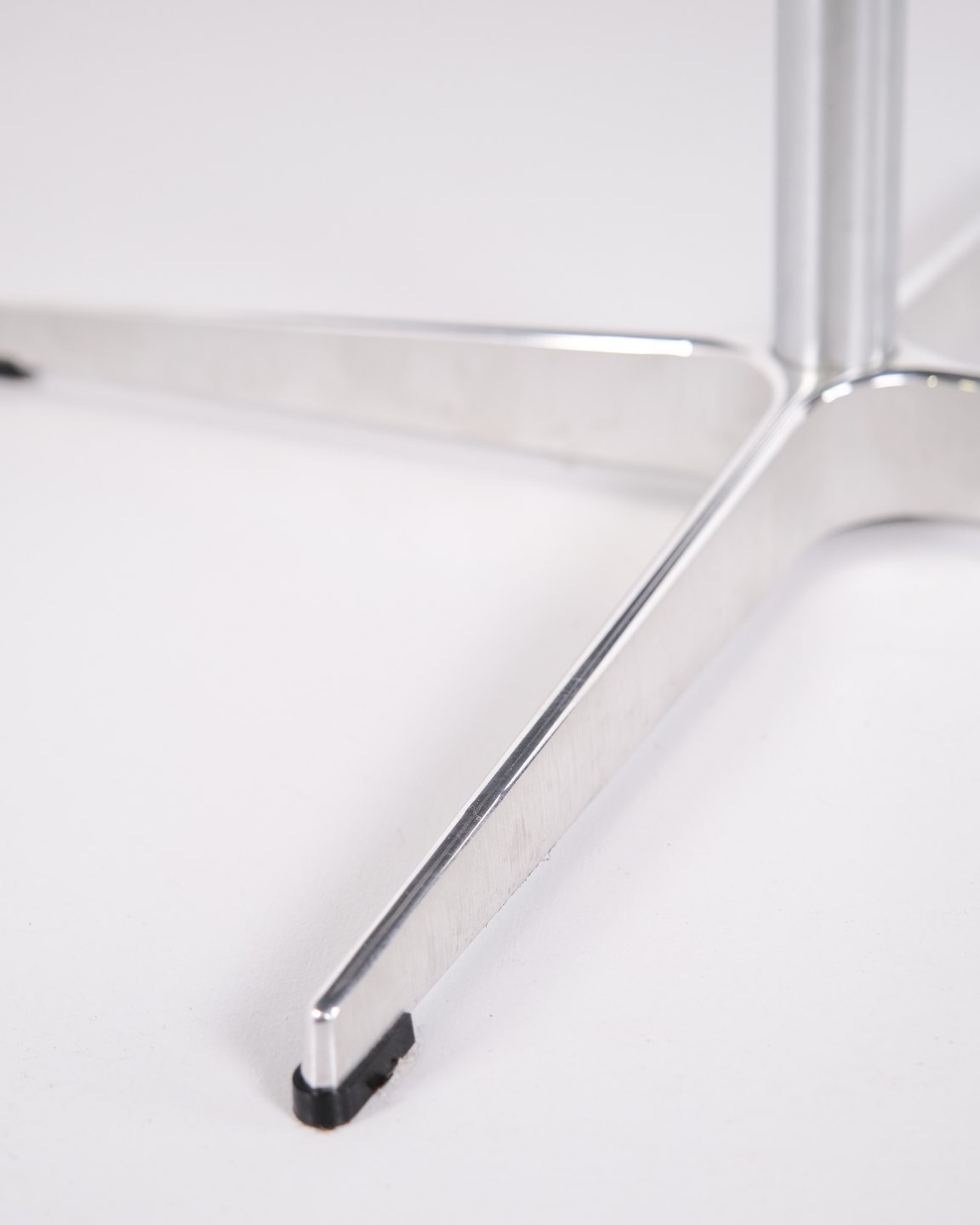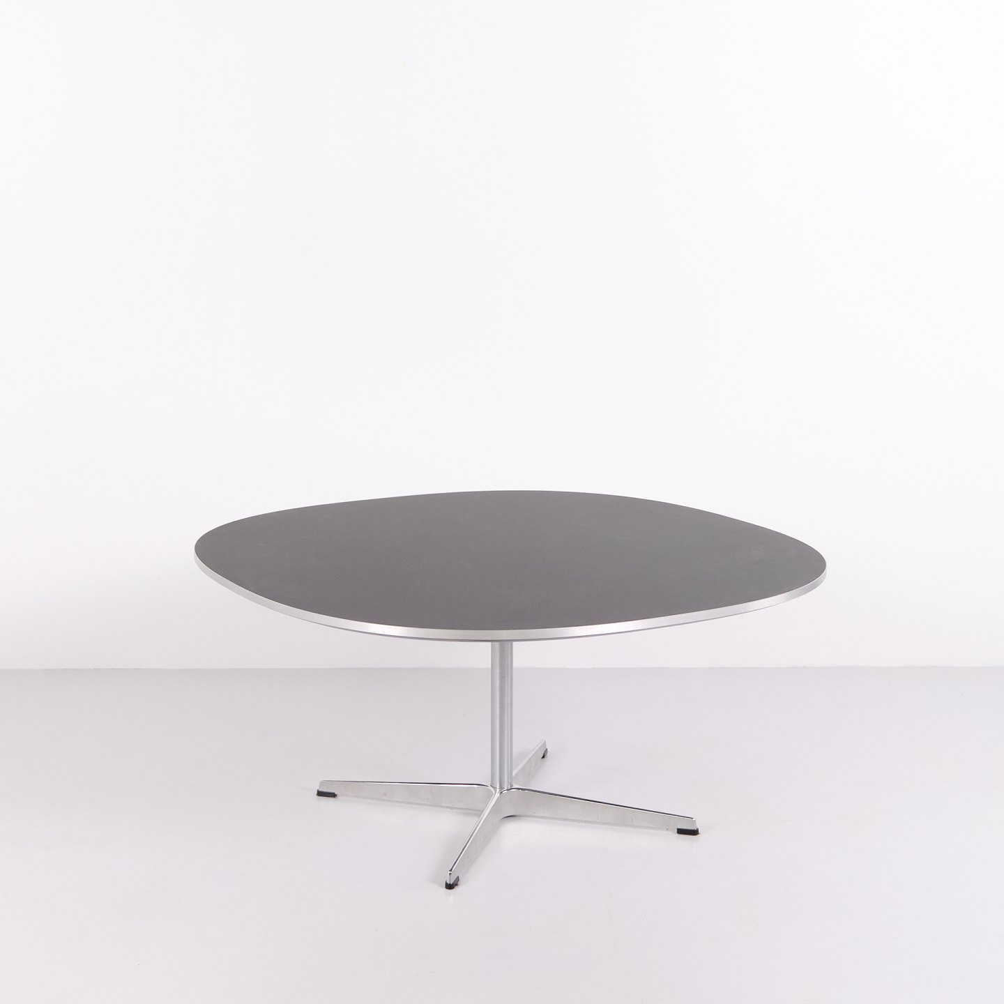Dieses Exemplar wurde 2023 bei Fritz Hansen gefertigt und verfügt über ein Gestell aus Aluminium sowie eine Tischplatte aus Schwarz Laminat. Der Tisch ist ein zeitgenössisches Beispiel dieses klassischen dänischen Designs.