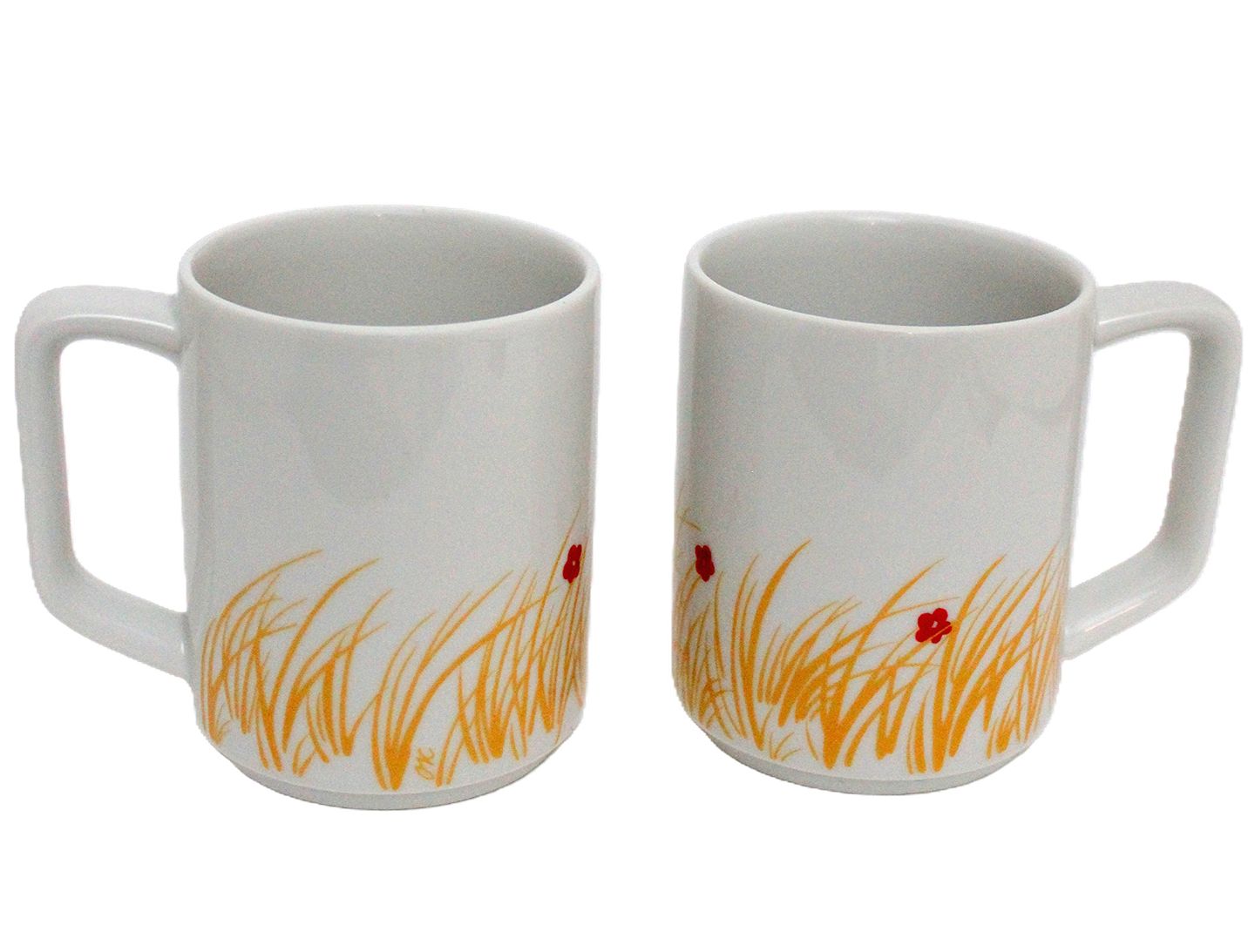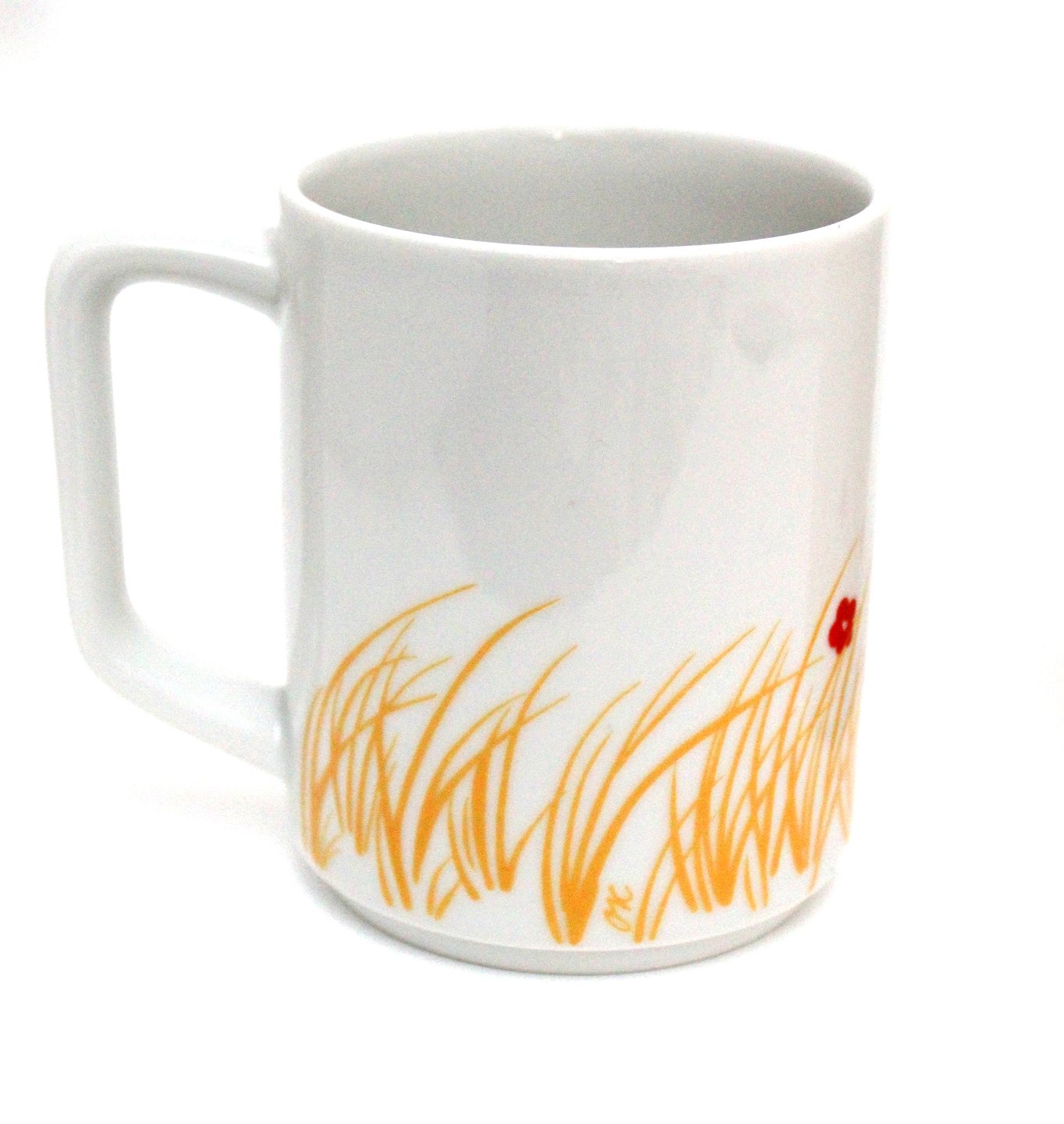 Text zugänglich auf Dänische: Royal Copenhagen, Picnic, Kaffekrus med gul dekoration. Designet af Grethe Meyer og Ole Kortzau. Nr. 6227. Dekoration 102. Højde 9,5 cm. Diameter 7,5 cm. Flot stand. I. sortering. Pris: 300 kr. stk. Lager: 2
