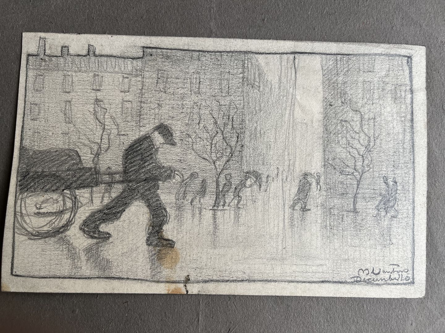 Tegning af Mogens Vantore - Mand med trækvogn i regnvejr 1920.